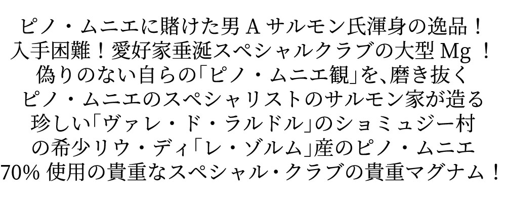 ![]() サルモン シャンパーニュ ブリュット スペシャル クラブ ミレジム 2015 ブリュット ショミュジー 白 辛口 高級泡 ■ぶどう品種:ピノ・ムニエ70%、シャルドネ30% ■平均樹齢:35年 ■栽培:リュット・レゾネ栽培 ■ドサージュ:ゼロ 「30年前まで、このエリアにはピノ・ムニエしか植えられていませんでした。その後国際的な品種ブームが起きて、ピノ・ムニエはどんどん引っこ抜かれ、かわりにピノ・ノワールやシャルドネが植えられていきました。しかし、先人たちの長い長い試行錯誤の歴史を経て、この地にピノ・ムニエが定着したのには理由があるのです。その理由を、私たちのシャンパンを飲んで実感していただければ本望です」とアレクサンドル・サルモン氏! 「それぞれのぶどう品種に特有の美質を得るためには、ヴィエイユ・ヴィーニュであることが重要。古樹より生まれるピノ・ムニエには、フリンティ(火打石)香とミネラルがたっぷりと含まれています」 ピノ・ムニエに賭けた男アレクサンドル・サルモン氏渾身の逸品が大型マグナムサイズで、しかも現地のセラー数ヶ月前の蔵出しで限定で極少量入荷! ![]() ![]() |