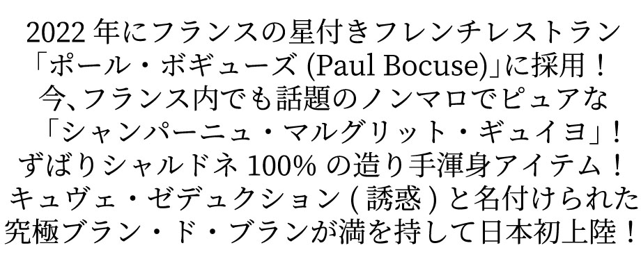 マルグリット ギュイヨ シャンパーニュ キュヴェ ゼデュクション ブラン ド ブラン ブリュット シャルドネ100% 星付きレストラン採用 ■ぶどう品種:シャルドネ100% ■発酵・熟成:マロラクティック発酵なし/瓶熟成36ヶ月以上 ■ドサージュ:7g/L 2022年にはフランスの星付きフレンチレストラン「ポール・ボギューズ(Paul Bocuse)」に採用されるなど、知る人ぞ知るシャンパーニュとして確実にその名を広めています! 味わいのスタイルは、コクがありながらも決して重すぎず、繊細でキメ細かい泡立ちでミネラル感とバランスの取れた酸が魅力!ハーモニーを重視し、長い瓶熟成によって、より複雑な表現力を感じさせるスタイルを見事に確立させています! 各品種の個性を活かせるよう、低ドサージュでなおかつ、全キュヴェが、マロラクティック発酵を行わない独特のシャンパーニュでもあることも他社とは異なる個性を感じることが出来ます!少しエスプリが効いて、しなやかで優雅なシャンパーニュ!