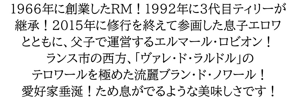 ![]() ランス市の西方、「ヴァレ・ド・ラルドル」のレリー村に1966年に創業したRMで、1992年に3代目ティリー・ロビオンが継承。2015年に修行を終えて参画した息子エロワとともに、父子で運営しています。 長年の厳格なリュット・レゾネ栽培を経て、2011にビオロジー栽培に転換。2014年に「エコセール」の認証を取得し、同年産のぶどう100%で新作「VB01」を仕込みました。 ![]() 「ここヴァレ・ド・ラルドルは、ランス山に発して西に下るアルドル川流域に広がる産地です。栽培品種はピノ・ムニエが主体で、次がピノ・ノワールです。シャンパーニュ地方で最も寒冷な産地と言われており、この地のブラン・ド・ノワールは総じて、流麗でエレガントなスタイルになります。この「ヴァレ・ド・ラルドルのブラン・ド・ノワール」の美質を極めるために、ビオロジー栽培に転換しました」 ![]() 「VB01」は、2018年秋にリリースされるやいなやヨーロッパ中のソムリエや世界各国のインポーターからの注目を集め、フランス・ミシュラン3つ星の「ピエール・ガニェール」、世界のレストランランキングOADでかつてヨーロッパ第一位に輝いたこともあるスペイン・ミシュラン3つ星の「アスルメンディ」といった錚々たるトップレストランがオンリストを開始し、また、輸出比率もまたたく間に70%に達することになりました。2019年4月にシャンパーニュで開催された毎年恒例の春の祭典の会場では黒山の人だかりが絶えず、大きな話題となりました。 ![]() TECHNICAL NOTES 所在村 Lhery 醸造家 Thierry Robion 所有畑面積 4.38ha ドメーヌ継承年 1992年 栽培における特記事項 2011年よりビオロジー栽培。2014年に「エコセール」の認証取得 醸造における特記事項 除梗しない。ステンレスタンクによる醸造。ドザージュはビオのMCR(濃縮果汁)を使用 販売先 輸出70%(EU各国)、フランス国内30%(仏ミシュラン3つ星「ピエール・ガニェール」をはじめとする高級レストラン、ワインショップ、個人のシャンパン愛好家) 掲載実績のある海外メディア 「Guide Hachette」、「Elle a Table」等 |