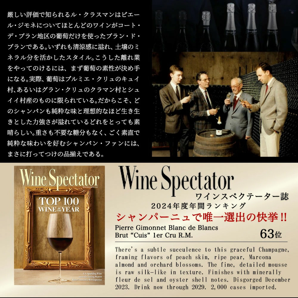 【商品説明】入手困難!シャンパーニュ愛好家大注目!大人気R.M.シャンパーニュ愛好家大注目!大型マグナムサイズ愛好家大注目!待望のグレイトヴィンテージ[2009]年 (ロバート・パーカー・ワインアドヴォケイト誌も92点をつけるグレイトヴィンテージ) で遂に入荷! スタンダードの“キュイ”・プルミエ・クリュ・一級で、ワインスペクテーター誌驚異の93点で2024年度年間ランキング第63位 (シャンパーニュの選出はこのピエール・ジモネのみという快挙) 獲得!ワイン&スピリッツ誌の2022にて世界のトップ100ワイナリーに選出!そのワイン・オブ・ザ・イヤーTOP100にてシャンパーニュより4社選出!名だたるシャンパーニュメゾンが並ぶ中、このピエール・ジモネが選出される快挙! (ちなみに残り3社はルイ・ロデレール、ボランジェ、プチ・エ・バジャン) !のピエール・ジモネのオジェ・グラン・クリュ・ブラン・ド・ブラン! 造り手はシャルドネの聖地コート・デ・ブランのキュイイ村で1730年からの歴史を誇るR.Mシャンパーニュの名門!1936年よりぶどう栽培、醸造、瓶詰、販売まで一貫して行うレコルタン・マニュピュランとして、シャンパーニュを生産スタート「傑作である産地、それを明確に表現するドメーヌとしてのスタイル」という銘醸ピエール・ジモネ! あのロバート・パーカー氏5つ星 (これはボランジェやサロンやクリュッグを含め15社のみ) 生産者に挙げ、ヒュー・ジョンソン氏も注目すべきシャンパン生産者の10人のひとりに挙げ、厳しい評価で知られるル・クラスマン誌 (現レ・メイユール・ヴァン・ド・フランス誌) でも「どれをとっても素晴らしい。重さも不要な糖分もなく素直で純粋な味わいを好むシャンパンファンに打ってつけ。」と絶賛!ベタンヌ&ドゥソーヴに到っては、4B&Dマークをつけ「コート・デ・ブラン地区の中心にある非常に重要な生産者。素晴らしい一貫性をもって時流から外れず爽快感と香り豊かなフィネスに重きをおいたワインのスタイルを不滅にしてきた」と大絶賛! ピエール・ジモネの所有畑は28haのうちグラン・クリュは12haを所有!そのうちクラマン最高級シャルドネとして有名な特級に5.5ha、シュイイ・グラン・クリュに5.5ha!オジェにわずか1haを所有する究極造り手ピエール・ジモネ&フィス!この「ピエール・ジモネ・ミレジム・ド・コレクション・ヴィエイユ・ヴィーニュ・ミレジム[2009]年」は、シャンパーニュファン垂涎のシャルドネ100%の究極ブラン・ド・ブラン!しかも手摘み100%!しかもヴィエイユ・ヴィーニュ (古樹) !しかもドサージュ4.5g/L!しかもコレクションで、しかもレギュラーボトルとは味わいが違うと言われる、素晴しい熟成をするシャンパーニュファン感涙の大型マグナムサイズ!しかも豪華木箱入りの究極大人気シャンパーニュが限定で極少量入荷!