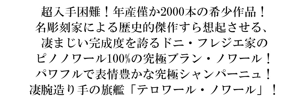 ![]() ドニ フレジエ シャンパーニュ テロワール ノワール ブリュット 2019 ブラン ド ノワール RM 生産者元詰 自然派 ヴァンナ チュール 辛口 ■ぶどう品種:ピノ・ノワール100% ■発酵・熟成:90%をステンレスタンクで、10%を205リットルと228リットルの樽で発酵後7ヶ月間熟成/3年間以上ビン熟成 ■ドザージュ:6.5g/l ■樹齢:平均樹齢40年のVV 「GuideーHachette」、「Decanter」等ワインプレスも大注目!パワフルで表情豊かなこのシャンパンは、アペリティフとして、あるいは白身の肉と一緒にお楽しみいただける究極辛口シャンパーニュ! 2016年にHVE(Haute Valeur Environnementale)の最高段階「レベル3」および「Viticulture Durable en Champagne」の認証を取得して最高度のリュット・レゾネを確立した後、2020年よりビオロジック栽培を実践。 醸造の各段階における細かな違いが加わると、組み合わせは何万通りにもなります。その中から、「ただひとつの完全なる調和」を見つけ出すのが私の仕事です。そしてその調和の中でこそ、細やかな泡の一粒一粒が、光り輝きます」。名彫刻家による歴史的傑作すら想起させる、凄まじい完成度です。 まずは双頭の旗艦作品、「テロワール・ノワール」と「テロワール・ブラン」からご紹介します。 年産2000本のみの蔵出し限定作品が超限定で極少量入荷! |