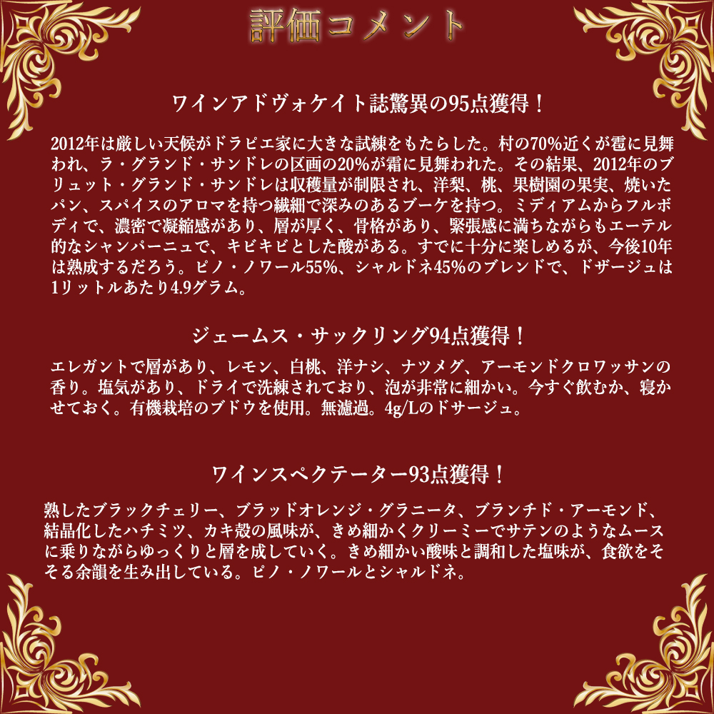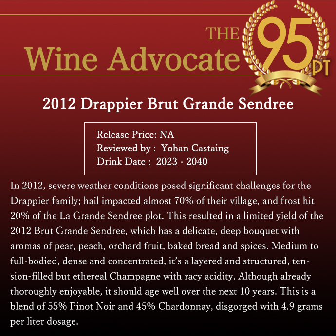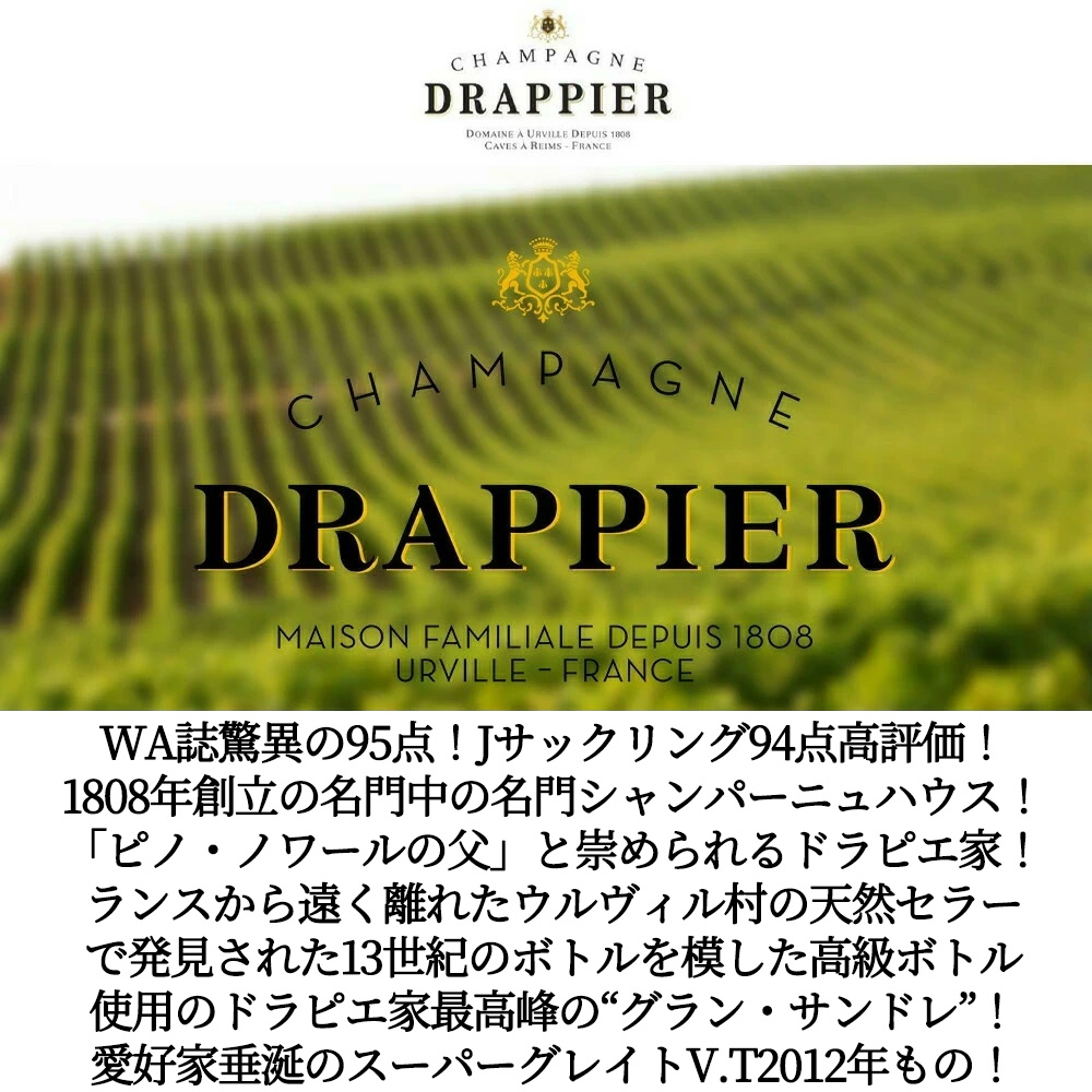 【商品説明】高級シャンパーニュ愛好家大注目!優れた収穫年にのみ限定で生産される究極ミレジム・シャンパーニュ!しかもシャンパーニュ愛好家にとって最も入手したいヴィンテージのひとつ!スーパーグレイトヴィンテージ[2012]年もの! (アシェット・ガイド誌2022年版では、18/20点の最高評価で18点以上は過去に1947、55,64、75、88、90、96と、この2012年の8ヴィンテージのみ!しかもロバート・パーカー・ワインアドヴォケイト誌も96点をつけるスーパーグレイトヴィンテージ[2012]年もの)!ランスから遠く離れたウルヴィル村の天然セラーで発見された13世紀のボトルを模した高級ボトル使用!の究極スペシャルキュヴェ!! 1808年創立の名門中の名門シャンパンハウス!ピノ・ノワールのスペシャリスト!「ピノ・ノワールの父」と崇められる究極シャンパーニュ!特にフランスの高級レストラン シャンパーニュとして有名!ロバート・パーカー4つ星★★★★生産者に挙げ、このグラン・サンドレのスーパーグレイトヴィンテージ2012年ものに過去指折りの驚異の95点高評価でコメントは「2012年は厳しい天候がドラピエ家に大きな試練をもたらした。村の70%近くが雹に見舞われ、ラ・グランド・サンドレの区画の20%が霜に見舞われた。その結果、2012年のブリュット・グランド・サンドレは収穫量が制限され、洋梨、桃、果樹園の果実、焼いたパン、スパイスのアロマを持つ繊細で深みのあるブーケを持つ。ミディアムからフルボディで、濃密で凝縮感があり、層が厚く、骨格があり、緊張感に満ちながらもエーテル的なシャンパーニュで、キビキビとした酸がある。すでに十分に楽しめるが、今後10年は熟成するだろう。ピノ・ノワール55%、シャルドネ45%のブレンドで、ドザージュは1リットルあたり4.9グラム。」と大注目! さらにジェームス・サックリング94点で「エレガントで層があり、レモン、白桃、洋ナシ、ナツメグ、アーモンドクロワッサンの香り。塩気があり、ドライで洗練されており、泡が非常に細かい。今すぐ飲むか、寝かせておく。有機栽培のブドウを使用。無濾過。4g/Lのドサージュ。」! ワインスペクテーター93点で「熟したブラックチェリー、ブラッドオレンジ・グラニータ、ブランチド・アーモンド、結晶化したハチミツ、カキ殻の風味が、きめ細かくクリーミーでサテンのようなムースに乗りながらゆっくりと層を成していく。きめ細かい酸味と調和した塩味が、食欲をそそる余韻を生み出している。ピノ・ノワールとシャルドネ。」と大注目!「レ・メイユール・ヴァン・ド・フランス」誌高評価!ステファン・タンザー「インターナショナルワインセラー」高得点獲得!Dessert-Gerberでもグラン・サンドレが2es Grands Vins Classesに格付!ソムリエ・インターナショナル誌でも大注目!ベタンヌ&ドゥソーヴやR.V.F誌、ワインエンスージアスト誌でも大注目! 1152年にシトー派修道僧たちによって築かれた修道会セラーにて熟成された究極シャンパーニュ!ドラピエ社の技術の全てを傾けて完成させたスペシャル・キュヴェ!全ての工程ですべて手造りを貫いた最高シャンパーニュ!シングルロケーションのピノノワール55%とシャルドネ45%の究極ブレンド!をマロラクティック発酵後最低驚異の7年以上の熟成を経て、しかもドサージュ4.9g/lの本格派ミレジム (単一年産100%) シャンパーニュ! トパーズのニュアンスのあるペール・イエロー!アカシアの花やハチミツ、 ビーズワックス、マジパン!ラズベリージャムの香り、すばらしいフィネスと芳香をたたえ、豊かでコクのあるしっかりした辛口の究極の味わい!余韻のデリケートなミネラル感とマンダリンオレンジのヒントのある、ビターな感覚が素晴らしい最高級ミレジメシャンパーニュが最新ヴィンテージで大人気スーパーグレイトヴィンテージ[2012]年ものでしかも豪華箱入りで正規品で極少量入荷!