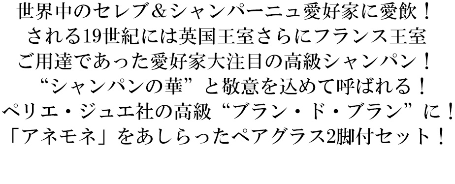 【商品名】ペリエ ジュエ ブラン ド ブラン シャンパーニュ AOCシャンパーニュ 辛口 フランス 結婚祝 記念日 お祝い【豪華ギフト箱入 ペアグラス】 【英名】Perrier Jouet Blanc de Blancs Champagne AOC Champagne (Deux Flutes) Gift BOX 【商品説明】高級シャンパーニュ愛好家大注目!高級ブラン・ド・ブラン愛好家垂涎!ペリエ・ジュエ“ブラン・ド・ブラン”のグラス付きセットが登場!世界中のセレブ&シャンパーニュ愛好家に愛飲され、“フルール・ド・シャンパーニュ(シャンパンの華)”と敬意を込めて呼ばれる大人気シャンパーニュ!“ベル・エポック”であまりに有名!シャンパーニュの中心地エペルネ本拠地で1854年から150年以上の歴史ある大人気シャンパンメゾン!ロバート・パーカー氏も4つ星をつける生産者で19世紀には英国王室!さらにフランス王室御用達でもあった高級シャンパーニュ!辛口シャンパーニュを最も早くから手がけ、数ある中でも最も粋なシャンパーニュとして通っていた究極シャンパーニュ!ペリエ・ジュエ渾身の究極ブラン・ド・ブラン!「圧倒的な生命力と爽やかさを兼ね備えたペリエ・ジュエ・ブラン・ド・ブランは、メゾンを象徴するブドウ、シャルドネにオマージュを捧げている」と最高醸造責任者エルヴェ・デシャン氏!7代目最高醸造責任者であるエルヴェ・デシャン氏は、メゾンのパイオニア精神と200年以上にわたって培ってきたシグネチャーのセパージュ・シャルドネに関する専門知識を集約し、シャルドネのみを使用してこの特別キュヴェを完成させた傑作品!シャンパーニュ地方の最高のブドウ畑で収穫されたシャルドネのみを使用!手摘み100%!完全MLF発酵!ドサージュ8g/lの本格派辛口!AOC規定の最低2倍以上の熟成!という超こだわり究極ブラン・ド・ブラン!透明感のあるペールゴールドに、グリーンがほのかに煌めく!エルダーベリー、アカシア、セイヨウスイカズラというワイルドフラワーが持つ生き生きとしたアロマとシトラスの香りが融合し、絶妙なノートを生み出しており、弾けるような活気と爽やかな口当たりに続き、ミネラルを感じさせるアクセントがこのひとときを締めくくる!無限のパワーと生命力を秘めた活気あふれるキュヴェに仕上がったペリエ・ジュエ社渾身の究極ブラン・ド・ブラン!しかも「アネモネ」をあしらった限定フルートグラス2脚!(ペリエ・ジュエのオリジナル・グラスがペアで(2脚付))の限定品が正規代理店輸入品で専用で限定入荷! 【タイプ】シャンパーニュ 白 【テイスト】辛口 【生産者】ペリエ ジュエ 【生産地】フランス / シャンパーニュ / AOCシャンパーニュ 【品種/セパージュ アッサンブラージュ】シャルドネ 【内容量】750ml 【JANコード】0103004012885