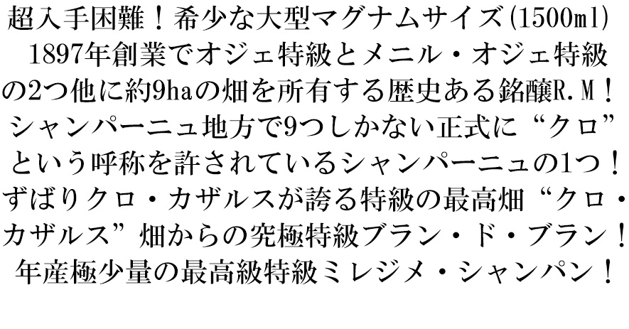 ![]() クロード・カザルスは1897年に初代アーネスト・カザルスによって、メニル・シュル・オジェに設立された、4世代約120年間にわたる歴史を持つ家族経営のドメーヌ。隣り合うが個性の異なるル・メニル・シュール・オジェとオジェの2つのグランクリュを所有。ル・メニルからはしっかりとした骨格が、オジェからは熟した果実が得られ、リッチなブラン・ド・ブランに仕上がる。希少なクロをオジェに所有する貴重な生産者。 ![]() ブドウ栽培にはリュット・レゾネを採用。醸造にはステンレスタンクを用い、アルコール発酵とマロラクティック発酵を行う。ベースワインの醸造はル・メニル・シュール・オジェの醸造施設で行われるが、最低でも36ヶ月という長い熟成にはオジェにある邸宅の地下セラーが用いられる。この建物は国際連盟の設立者のひとりであるレオン・ブルジョワの元別荘で、それを取り囲むように広がる畑、クロ・カザルはクロード・カザルの代名詞である。 ![]() クロ・デュ・メニルやクロ・デ・ゴワセと同じ数少ないクロの単一畑のシャンパーニュであり、ニール・ベケットの『1001 Wines you must tastebefore you die(死ぬ前に飲むべき1001ワイン)』や、フランスの主要ワインガイド、ルヴュ・デュ・ヴァン・ド・フランスの『偉大なブラン・ド・ブラン』特集に大きく取り上げられている。 | ![]() ■ぶどう品種:シャルドネ100% ■発酵・熟成:熟成驚異の約120ヶ月熟成/ ベースワインの一部はバリック発酵/ 瓶内での熟成期間は12年 ■樹齢:樹齢驚異の約75年(1957年植樹)の古木(ヴィエイユ・ヴィーニュ) ■ドサージュ:2g/L 入手困難!愛好家垂涎の大型特級マグナムサイズ!高級グラン・クリュ・特級オジェ100%のヴィエーユ・ヴィーニュ100%生産者元詰・RMシャンパーニュの大型サイズ愛好家大注目! シャンパーニュ地方でも特に優れたシャルドネを生み出す銘醸地、コート・デ・ブランのグラン・クリュ!シャルドネの銘醸地グラン・クリュ特級のオジェ村のシャルドネ100%のブラン・ド・ブランの大型サイズ! マイケル・エドワーズの「シャンパン」でもクロ・カザルスの1999年に「深く優美なウェールズ風ゴールド。熟れているがミネラル主流の香り!口に含むと美しいシルクのようなしっかりとした質感がふくらみのある豊かな果実味を備えている」と大絶賛! クロード・カザルスが誇るグラン・クリュ・特級の最高畑“クロ・カザルス”畑から得られた最高級シャルドネ!大人気!究極特級ブラン・ド・ブランのVVのクロ・カルザスのブリュット・ナチュール・シャンパーニュの大型マグナムサイズが正規品の蔵出し品で限定で極少量入荷! |
