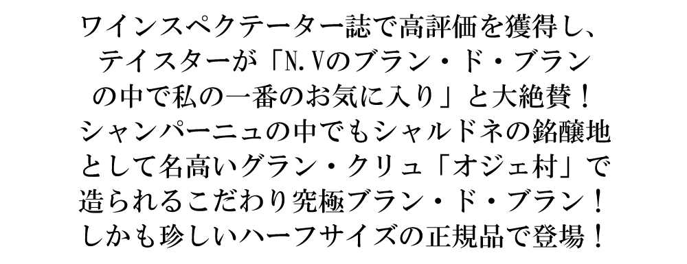 ![]() シャンパーニュ地方でも特に優れたシャルドネを生み出す銘醸地、コート・デ・ブランのオジェ村に位置する家族経営のワイナリーです。シャピュイ家はフランス革命の時代から既にオジェでワイン造りを行い、地元の市長も務めるなど、この地と関わりの深い一族です。「最高級のシャンパーニュをお手頃な価格で」の経営理念の元、1952年より当時の当主セルジュによりシャンパーニュの生産がはじめられ、現在は息子のセルジュが後を継ぎ経営を行なっております。 ![]() シャピュイが畑を持つオジェ村が位置するコート・デ・ブラン地区はシャンパーニュの中でも特に優れた石灰質土壌で、地表のすぐ下に石灰質が広がります。この石灰質の豊富なミネラル分により、複雑な味わいのシャルドネが生み出されます。また、オジェ村の他、ヴァレ・ド・ラ・マルヌにあるモンテロンと、コート・ド・セザンヌにも畑を所有します。古いもので樹齢は50~60年。畑を耕すのはトラクターと馬を併用し行います。こうすることにより土壌が圧縮されずに、土中の微生物環境も最適に保たれます。 ![]() 圧搾後、果汁を3漕に分けます。シャピュイのシャンパーニュで使用するのは2050?のテット・ド・キュヴェのみ。プルミエ・タイユはネゴシアンへ、残りの果汁はマールとして使用する業者に売却します。シャルドネの酸度や、フィネスを保つため、マロラクティック発酵は行いません。畑ごと、葡萄品種ごとに、別々のタンクで一次発酵させます。リキュール・デクスペディションはシャルドネをベースとしたリキュールを使用しています。 | ![]() ■ぶどう品種:シャルドネ100% ■発酵・熟成:ステンレスタンク発酵、瓶内二次発酵!瓶熟36ヶ月後デゴルジュマン 高級シャンパーニュ辛口愛好家大注目!グラン・クリュの珍しいハーフサイズ!コート・デ・ブランのグラン・クリュ・特級! リキュール・デ・エクスペディションは7g/L!輝きのあるゴールド!繊細な泡!フレッシュな白い花をイメージさせるエレガントな香り。 菩提樹の花や西洋サンサジなどの香味深い味わいの人気グラン・クリュ・ブラン・ド・ブラン! なんと!グラン・クリュのオジェ100%のシャルドネ100%が、シャンパーニュ価格高騰時にびっくりプライス!でしかも珍しいハーフサイズの正規品で限定で極少量入荷! |