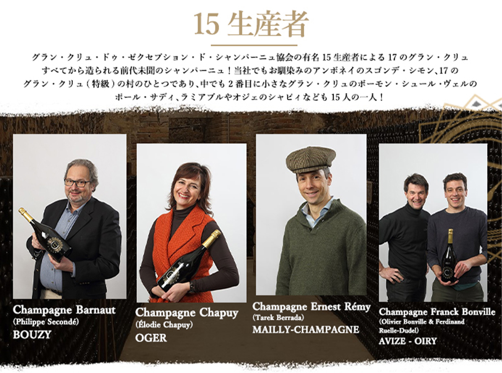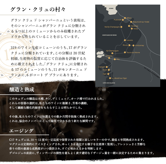 ![]() 2017年、私たちは、この地域の歴史的で真に並外れた構成であるシャンパーニュの17のグラン・クリュをブレンドした共通のキュヴェを作成するという大胆なアイデアを思いつきました。これは、15 のワイン生産者が自らの生産した果実を供給する取り組みであるため、さらに注目に値します。 ![]() 収穫後、私たちはこれらの優れたテロワールのそれぞれからブドウを集め、伝統的な圧搾機で 4000 kg の搾りかすを形成します。 情熱、土地への愛情、協会の15人のメンバー間の交流と協議が真に凝縮されたワインは、数量限定でマグナムのみで常にヴィンテージで生産されます。私たちは当然、その熟成の特質とそれがもたらす芳香の発達のためにこのボトルを選びました。 | ![]() ■ぶどう品種:ピノ・ノワール65%/シャルドネ35% 超入手困難!前代未聞!高級シャンパーニュ愛好家垂涎!高級シャンパーニュにおける17のグラン・クリュ・特級格付けから各特級から1社のみ、 有名15生産者による17のグラン・クリュすべてから造られる前代未聞のシャンパーニュ! ワインと料理の組み合わせ:カボチャのスープ、ダブルクリーム、カルダモンシード、ポーチドエッグ添え、挽いたコーヒー豆とミモレットチーズを添えて (レシピはミシュラン2つ星レストラン「レ・クレイエール」のシェフ、フィリップ・ミル著『Futs et foudres de la Champagne』より抜粋)! まさに愛好家(コレクター)垂涎作品がセラー出しの素晴らしい状態でしかも豪華木箱入りのマグナムサイズで超限定少量入荷! |