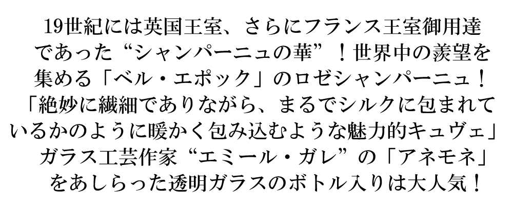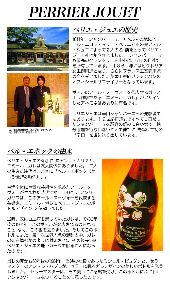 1811年、シャンパーニュ、エペルネの地にピエール・ニコラ・マリー・ペリエとその妻アデル・ジュエによって2人の名 前をとってペリエ・ジュエ社は創立されました。 シャンパーニュでも最高のグランクリュを中心に、65haの自社畑を所有しています。1861年にはビクトリア女王御用達となり、さらにフランス王室御用達の命を受けました。英国王室向けシャンパンのオフィシャルサプライヤーとなっています。 ボトルはアール・ヌーヴォーを代表するガラス工芸作家である「エミール・ガレ」がデザインしたアネモネはあまりに有名です。ペリエジュエは辛口シャンパーニュの先駆者でもあります。19世紀初頭まですべて甘口だったシャンパーニュを顧客の好みに合わせて、糖分添加を行なわないことで他社に 先駆けて初の「辛口」を世に送り出しています。 ペリエ・ジュエの3代目社長アンリ・ガリスと、エミール・ガレは友人関係にありました。 二人の生きた時代は、まさに「ベル・エポック(美しき優雅な時代)」。生活全体に良質な芸術性を求めたアール・ヌーヴォーが生まれた時代です。 1902年、アンリ・ガリスは、このアール・ヌーヴォーを代表する芸術家、エミール・ガレにペリエ・ジュエのボトルデザイン を依頼しました。当時、既に白血病を患っていたガレは、その2年後の1904年、このボトルが発表されるのを見ることなく、この世を去りました。そしてこのボトルもまた、第一次世界大戦の混乱の中、ガレの死を悼むかのように封印され、その後長い間ペリエ・ジュエの地下カーヴで眠ることになったのです。 ガレの死から60年後の1964年、当時の社長であったミシェル・ビュダンと、セラーマスターのアンドレ・バブレが、セラーに眠るガレデザインの美しいボトルを発見しました。 ガレの死から60年後の1964年、当時の社長であったミシェル・ビュダンと、セラーマスターのアンドレ・バブレが、セラーに眠るガレデザインの美しいボトルを発見しました。 セラーマスターは、その美しさに感銘を受け、このボトルにふさわしいシャンパーニュをつくることを決意したのです。「描かれていた白いアネモネの花がシャルドネの持つ繊細さを見事に表現している」と、グラン・クリュのシャルドネを 主体としたスペシャルキュベを醸造、5年の熟成を経て、1969年発表されました。このシャンパーニュこそが、「ベル・エポック」です。アンリ・ガリスとガレが生きた時代の名をつけたこのシャンパーニュは、その繊細でエレガントな味わいと、優美で気品あるボトルデザインが一世を風靡し、「フルール・ド・シャンパーニュ(シャンパンの華)」と称されるプレミアムシャンパンとなりました。 | ![]() ■ぶどう品種:シャルドネ45%/ピノ・ノワール50%/ピノ・ムニエ5% ■発酵・熟成:驚異の6年以上の熟成 高級シャンパーニュ愛好家大注目!最高級ロゼ・シャンパーニュファン大注目!世界中のセレブ&シャンパーニュ愛好家に愛飲される究極シャンパーニュ! 19世紀には英国王室!さらにフランス王室御用達であった高級シャンパーニュ!辛口シャンパーニュを最も早くから手がけ、数ある中でも最も粋なシャンパーニュとして通っていた究極シャンパーニュ! シャルドネのもたらすその芳醇な香りとフレッシュさによって特徴づけられ、豊かなピノ・ノワールとフルーティーなムニエによってバランスのとれたキュヴェとなっています! ワインスペクテーター誌やワインエンスージアスト誌、ジェイムス・サックリング等各ワイン誌大注目!プロも認める最高級シャンパーニュ・ロゼが大人気ヴィンテージ[2014]年で正規代理店輸入品で限定少量入荷! |