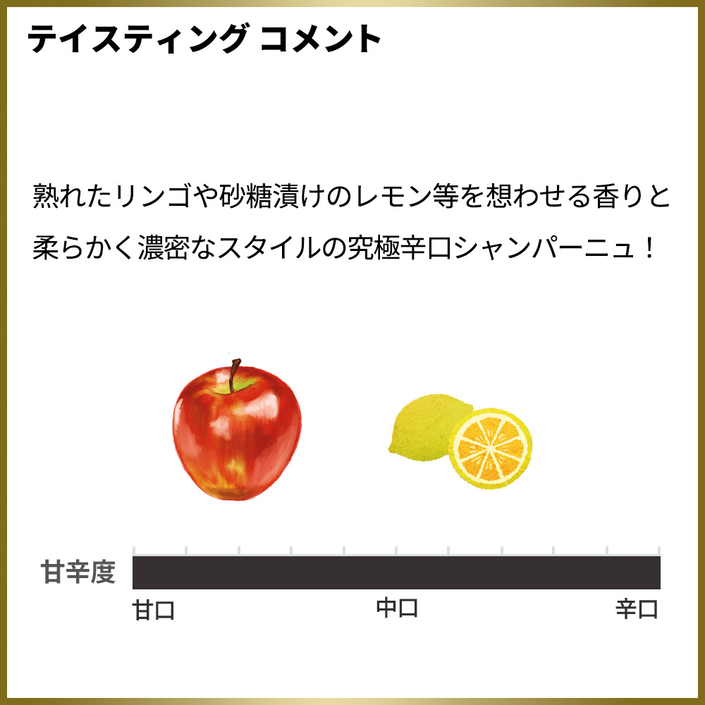 【商品説明】大人気シャンパーニュ辛口愛好家大注目!R.Mシャンパーニュ愛好家大注目!“大地のメッセージ”を届けるコート・デ・ブランの極めて小さなレコルタン・マニピュラン!リリース以来、その非常に高い品質が評判を呼び、フランス国内でも入手困難!ドメーヌの在庫は、常に完売状態という極めて少量生産の小さなR.M(レコルタン・マニピュラン)!生産者元詰シャンパーニュ! 造り手は、現オーナークリスチャン・ブルモーで5代目、1870年に遡る歴史を持つ造り手で、クリスチャンが初めて造った1982年に、父ウィリアムから1.6haの畑を相続(1haは、1981年に祖父の弟から購入)!キュヴェは1982年ですが、現在では6haで自社所有畑を広げるまでに!現在では息子のアントニーとともに畑に真摯に向き合い、職人的なシャンパーニュを造り続けるクリスチャン・ブルモー!インポーターさんの造り手の説明は「リリース以来その非常に高い品質が評判を呼び、フランス国内でも入手困難、在庫は常に完売状態という極めて少量生産の小さなR.M.(レコルタン・マニピュラン)シャンパーニュメゾンです。もとは1870年に遡る栽培農家で、現在のオーナー、クリスチャン・ブルモー氏で5代目。ワイナリーはクリスチャンがをコート・デ・ブランのキュイにある1ヘクタールの畑を祖父の弟から購入して1981年に設立。続いて1982年には父ウィリアムから1.6ヘクタールの畑を相続し、樽醗酵、樽熟成というスタイルを取ってきました。1999年に一人息子のアントニーが加わったことをきっかけに、キュイにあった本拠地を、醸造施設を完全に備えたアヴィズ(現在のワイナリーの本拠地)にを移しました。*現在も彼の兄弟や親戚関係でワイナリーを営む人は、キュイに本拠地を置く。父の仕事を手伝いながらシャンパーニュ造りを覚えたので、学校には通わず全て独学。剪定や植樹等のワイナリー運営にまつわる資格は全て取得しています。シャンパーニュのオーナーに良く見られる高慢なタイプではなく(大手のグラン・メゾンに多い)、クリスチャンは冷静沈着で、堅実家。彼の情熱はシャンパーニュとピアノに向けられています。ピアノはかなりの腕前。もともとリュット・レゾネ、リュット・アンテグレを行っていましたが、現在ではビオロジックを採用しています(認証無し)。クリスチャン氏がワイナリーを運営するようになってから、農薬の使用はせず、完全に有機肥料での栽培になりました。醸造は、樽醗酵の樽熟成というスタイルを採用。アルコール醗酵は、220Lのオーク樽とタンクにてゆっくり行い、醗酵の際の温度は17度から20度に自然に保たれ、果実感とアロマを最大限に引き出すようにしています。マロ・ラクティック醗酵はヴィンテージによって行う年とそうでない年があり、部分的に行うことの方が多いです。リザーヴ・ワインの比率はとても高く、保存期間は5年から10年。そうすることにより味わいのバランスが保たれ、シャンパーニュ・クリスチャン・ブルモーの特徴を作っています。」 この『クリスチャン・ブルモー・シャンパーニュ・キュヴェ・エルマンス・ブリュット』は、粘土石灰質土壌からのリュット・レゾネの平均樹齢35年のピノ・ノワール67%、シャルドネ23%、ピノ・ムニエ10%使用!瓶内二次醗酵!オーク樽8ヶ月熟成(新樽は使用せず、225L)!瓶内熟成期間22ヶ月!で造られる樽醗酵・樽熟成シャンパーニュ!熟れたリンゴや砂糖漬けのレモン等を想わせる香りと柔らかく濃密なスタイルの究極辛口シャンパーニュ!極小R.Mクリスチャン・ブルモーの渾身作品が超限定で少量入荷!