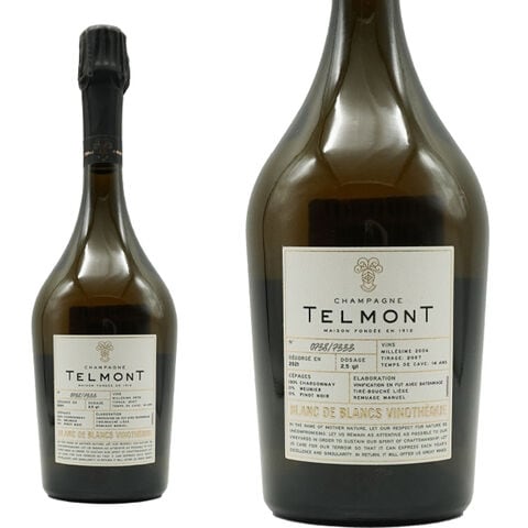 【商品説明】希少!シャンパーニュ辛口愛好家大注目!しかも造り手は、シャンパーニュ地方のヴァレ・ド・ラ・マルヌ地区、美しく自然の豊かなダムリー村に位置する、「最後の正統派メゾン」の異名をとる、1912年創業(109年目を迎える)の家族経営メゾン!4代目にあたる現当主、ベルトラン・ロピタル氏は、一族のみに受け継がれてきた門外不出の醸造レシピを守りながら、さらなるクオリティーの高さを求めてシャンパーニュを作り続けています!22haのぶどう畑には、1級畑や特別に恵まれたテロワールの区域も含まれ、ぶどうの品質は極めて高く、畑でのぶどう栽培・収穫の段階から醸造や熟成の細部にいたるまで、徹底的にこだわった造りをしています!また家族経営のメゾン(2020年にレミーコアントローグループの傘下)ならではの丁寧で温かみのある味わいが、特にヨーロッパを中心に高く支持されており、南仏の人気2ツ星レストラン<ジャルダン・デ・サンス>のハウスシャンパンにも選ばれています! その哲学は「アルチザン(職人による伝統的な製法での少量生産)」と「サステナビリティ」という2つの大きな柱から成り立ち、小規模ながらもプレステージ・シャンパーニュ・メゾンとして確固たる地位を築いています!ずばりテルモン社による特別な最高級プレステージ・キュヴェ!“テルモン・シャンパーニュ・ブラン・ド・ブラン・ヴィノテーク・エクストラ・ブリュット・ミレジム[2006]年”!「2006年はシャルドネの豊かな収穫の年がもたらしたヴィンテージとなりました。年間セラーで丹念に熟成したブラン・ド・ブランは卓越した味わい、リッチさ、そして複雑さを生み出しました。」 シャルドネの豊かな収穫の年がもたらしたヴィンテージ2006年単一年産の厳選シャルドネ100%をバトナージュを行いながら樽発酵!コルク栓で打栓して熟成!2007年に瓶詰めされ、驚異の15年(180ヶ月)熟成で長い時を経て世にリリースされる希少作品!ドサージュ2.5g/Lの極辛口仕上げの究極エクストラ・ブリュット! セラーマスターのこの2006年へのテイスティングコメントは「焼いたフルーツ、デーツ、アーモンドの魅惑的なアロマが感覚を呼び覚まします。ローストしたヴァニラの洗練された香りを呼び起こし、豊かで繊細な塩キャラメルで微かに強調されています。美しい複雑さが続き、驚くべき滑らかさが最高潮へ向かいます。」と絶賛! エチケットにすべての情報(セパージュ、ヴィンテージ、製法詳細、ドサージュ、デゴルジュマン、ブランドマニフェスト等の)が記載されたエチケット!「最後の正統派メゾン」の異名をとるテルモンの最高級シャンパーニュ“ヴィノテーク”が正規代理店輸入品で限定で少量入荷!
