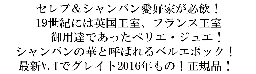 【商品名】【正規品】ペリエ ジュエ ベル エポック ブラン シャンパーニュ 2016 AOCミレジメ シャンパーニュ 正規代理店輸入品 750ml 【英名】PERRIER JOUET Cuvee BELLE EPOQUE Fleur de Champagne Millesime 2016 AOC Millesime Champagne 【商品説明】高級シャンパーニュ辛口愛好家大注目!ベル・エポックファン大注目!しかも最新ヴィンテージで、グレイトヴィンテージ2016年(ワインアドヴォケイト誌シャンパーニュに驚異の94点を付ける偉大なヴィンテージ)で待望入荷!世界中のセレブ&シャンパーニュ愛好家に愛飲され“フルール・ド・シャンパーニュ(シャンパンの華)”と敬意を込めて呼ばれる大人気シャンパーニュ!19世紀には英国王室!さらにフランス王室御用達でもあった高級シャンパーニュ!「フローラルで気品があり、スタイリッシュ。そしてダイヤモンド・カットの様な輝きを放つ洗練されたペリエ・ジュエ」!この2016年についてメゾンは「2016年の天候は、異常気象に見舞われ、生産者にとっては困難な年となりました。4月には霧が降り、多くのブドウが影響を受け、その後も雨が続きました。しかし夏になると天候が回復し、暑く乾燥した気候がブドウの成熟を助け、その結果高品質のシャンパーニュの生産を可能にしました。エレガントで繊細なメゾンのアイコン・シャンパーニュ」とコメント!50%のクラマン、アヴィーズ、シュイイのシャルドネからは、ミネラリティーとフローラルのノート!45%のピノ・ノワール、マイイ、ヴェルズィ、アイのグラン・クリュからは寛大さとフレッシュなフルーツのノート!わずか5%のディジー(Dizy)からのムニエからは、まろやかさとフルーツのアロマ!デゴルジュまで驚異の6年!この2016年は、秋の太陽のように輝きのある黄金色と立ち上る繊細な泡立ちが美しい!卓越した豊かなアロマが特徴!白い花の繊細なアロマを持ち、桃や梨などの白いフルーツの香り、ハチミツ、最後にはのかに香りブリオッシュ!口に含むと、エルダーベリー、ポーチドペア、グリーンペッパーなどの花やフルーツ、スパイスのニュアンスとともに複雑さが表現され、驚くほど繊細なテクスチャーが際立つ味わいです!ボトルはアール・ヌーヴォーを代表するガラス工芸作家“エミール・ガレ”の「アネモネ」!優良ヴィンテージの[2016]年で、しかも正規代理店輸入品で限定少量入荷! 【タイプ】白・辛口・シャンパーニュ 【生産年】2016 【生産者】ペリエ ジュエ 【生産地】フランス / シャンパーニュ / AOCシャンパーニュ 【品種/セパージュ アッサンブラージュ】シャルドネ50%、ピノ・ノワール45%、ムニエ5% 【内容量】750ml 【注意文】3113889001895 【JANコード】0103004014742