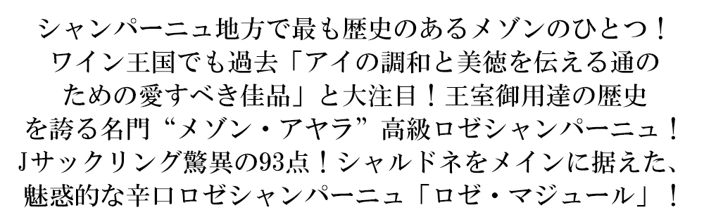 【商品名】【箱入】アヤラ シャンパーニュ ロゼ マジュール ブリュット (メゾン アヤラ) 正規代理店輸入品 AOCロゼ シャンパーニュ 【英名】Ayala Champagne Rose Majeuur Brut AOC Rose Champagne BOX 【商品説明】高級シャンパーニュ愛好家大注目!高級ロゼシャンパーニュ愛好家大注目!「シャルドネをメインに据えた、魅惑的なロゼ・シャンパーニュ」!ワイン王国でも「アイの調和と美徳を伝える通のための愛すべき佳品」と大注目!造り手は1860年にエドモン・ド・アヤラによりグラン・クリュ畑の広がるアイ村に誕生!150年以上の歴史を持つ、シャンパーニュ地方で最も歴史のあるメゾンのひとつ!で1882年に創立された「グランド・マルク組合」の設立メンバーであり、英国王室とスペイン王室御用達の歴史を誇る“メゾン・アヤラ”!2005年に同じくアイ村で高い評価を得ているボランジェ・ファミリーの一員となってからも、常に人間的な規模の家族経営メゾンとして、まさにオート・クチュールのシャンパーニュ造りを守り続けている!そんなメゾン・アヤラの見事なロゼ・シャンパーニュ!アヤラ・ロゼ・マジュールは、シャルドネを主体とした3つの品種(シャルドネ51% 、ピノ・ノワール39%(6%の赤ワインを含む)、ピノ・ムニエ10%)、最低36ヶ月以上瓶熟成、ドサージュ6g/lの辛口仕上げで造られるシャルドネのエレガントさが感じられる究極ロゼ・シャンパーニュ!ジェームス・サックリング驚異の93点でコメントは「ドライ・ストロベリーとリンゴのアロマと風味を持つ、とてもきれいなロゼ。スパイスの効いた洋ナシと鉄のニュアンスもある。クランベリーも。フルボディで正確さと引き締まった味わい。焦点の定まったしっかりした味わい。繊細な泡と余韻の長さ。常に素晴らしいロゼ。シャルドネ51%、ピノ・ノワール39%、ピノ・ムニエ10%。6g/lのドサージュ。」と高評価!さらにバーガウンドでも90点で「ストロベリー、ラズベリー、チェリーの可憐でエアリーなアロマと、発泡酒によく見られるイーストやトースティーなキャラクター。美味しく生き生きとした中程度の重さのフレーバーは、苦味のあるピット・フルーツと爽やかなフィニッシュで頂点に達する。」と大注目!淡く繊細な桜色!苺、ラズベリーなどの華やかな柔らかい赤い果実の香りに白桃のニュアンス!軽やかだが、風味をしっかりと感じられるアタックがあり、存在感ある味わい!シャルドネを50%使用したフレッシュな味わいに、ピノ・ノワールとピノ・ムニエ由来のラズベリーや西洋スグリなどの果実感がバランス良く溶け合っています!長く官能的な余韻を持つ上質な味わい!アヤラが誇る高級ロゼ・シャンパーニュが専用箱入りで正規品で待望入荷! 【タイプ】白・辛口 シャンパーニュ 【生産者】メゾン・アヤラ 【生産地】フランス/シャンパーニュ/ AOCミレジム・シャンパーニュ 【品種/セパージュ アッサンブラージュ】シャルドネ51% 、ピノ・ノワール39%(6%の赤ワインを含む)、ピノ・ムニエ10% 【内容量】750ml 【注意文】4571215622395 【JANコード】0103004015190