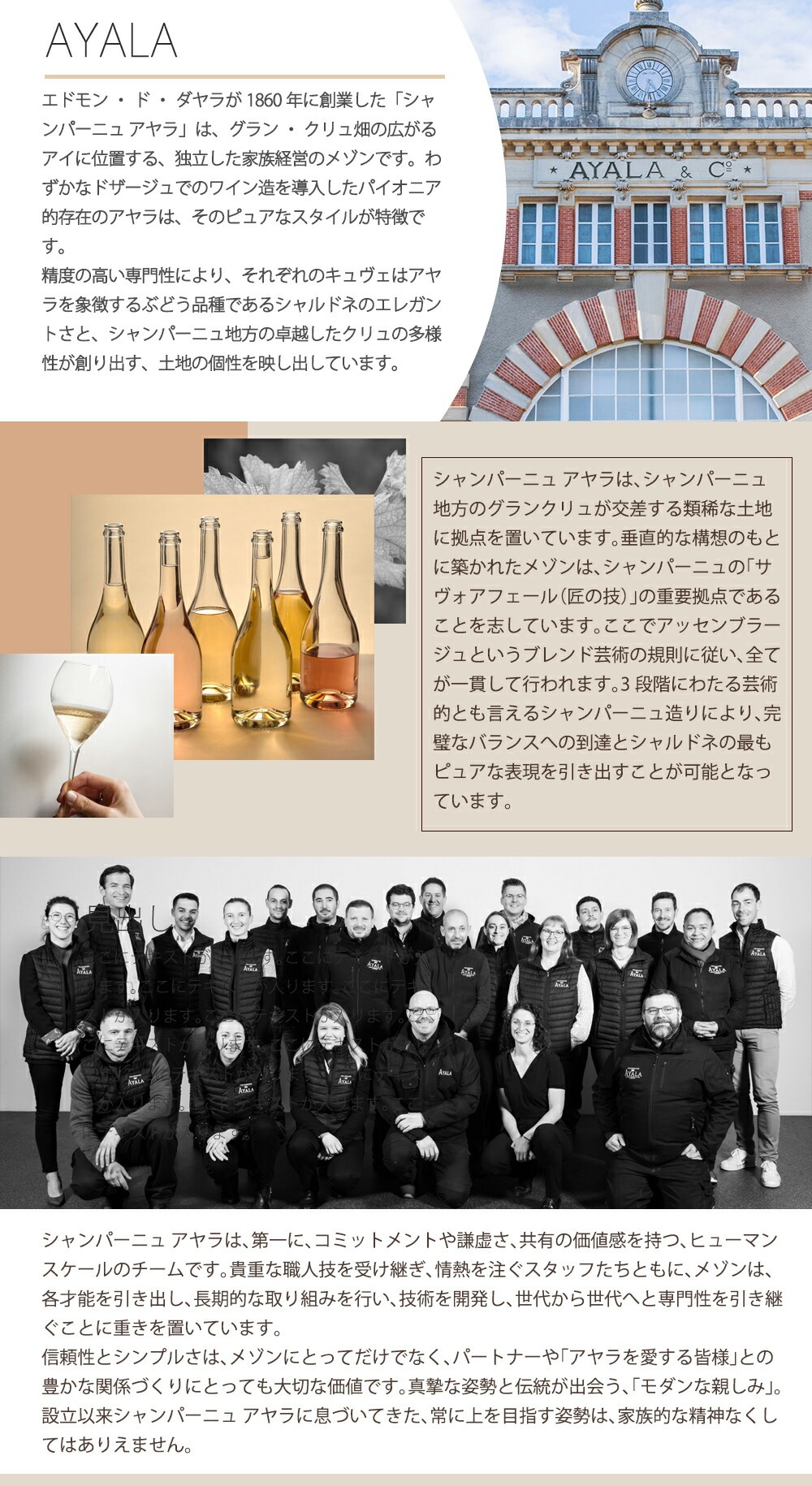 アヤラはもともとスペインの貴族の家柄であり、スペイン領であった南米で独立戦争を戦ったのち、コロンビアの外 交官としてパリに赴任した父を持つエドモンド・デ・アヤラが、シャンパーニュ地方でシャンパーニュ造りを学んだことから彼らの醸造の歴史が始まりました。