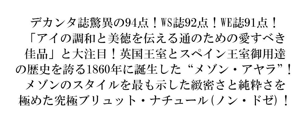 【商品名】【箱入】アヤラ シャンパーニュ ブリュット ナチュール メゾン アヤラ 正規代理店輸入品 専用箱入 AOCシャンパーニュ 【英名】AYALA Champagne Brut Nature AOC Champagne Gift BOX 【商品説明】シャンパーニュ愛好家大注目!「JALファーストクラスラウンジ」に過去採用された実績!ワイン王国でも「アイの調和と美徳を伝える通のための愛すべき佳品」と大注目!アヤラについて輸入元様は「グラン・クリュ畑の広がるアイで1860年に誕生した「シャンパーニュ アヤラ」は、 160年以上の歴史を持つシャンパーニュ地方でも最も古いメゾンの一つです。 ピュアでエレガントなスタイルで愛されているこのメゾンは2023年よりスタンダードキュヴェを一新し、 熟成したシャルドネのポテンシャルをさらに引き出したスタイルへと生まれ変わりました。エドモンド・デ・アヤラにより1860年に創業したアヤラは、当時ドサージュ100g/lほどの甘口が主流の中、1865年にドサージュ21g/lのみの辛口シャンパーニュを先駆者としてリリース。また1882年に作られたグランド・マルク組合の設立メンバーとなり、1908年には英国ロイヤルワラントの称号を獲得。1920年代には年間100万本もの生産を誇る黄金時代を迎えました。2005年にはボランジェファミリーの一員に。醸造所はステンレスタンクに特化した最新鋭の設備に刷新され、シャープでスタイリッシュなブランドアイデンティティを確立。2017年には再び生産量100万本に到達しました。またアヤラは、2012年より10年かけてキュヴェの個性と品質を向上させてきました。2023年にその集大成として、熟成したシャルドネのポテンシャルをさらに引き出したスタイルへとリニューアル致しました。アヤラは、コート・デ・ブランのグラン・クリュ、シュイィ、オジェ、そしてシャンヴォワジー、パッシー=グリニー、ヴァレ・ド・ラ・マルヌに畑を所有。多様性を尊重し、70のクリュ、それぞれの品種・ヴィンテージごとに、独立したサイズの異なるステンレスタンク(5~200hl)120個を用い醸造。ぶどうの受け入れからデゴルジュマンまですべてをひとつの場所で行い、人の手をできる限り介在させないことで、ぶどうのポテンシャルを最大限引き出しています。古くよりシャルドネは私たちのアイコンであり、ブレンドにおいても全体の50%以上がシャルドネです。そのフレッシュさ、フィネス、まっすぐで軽快なキャラクターは、アヤラのスタイルのために欠かすことのできません。そしてピノ・ノワール、ピノ・ムニエはシャルドネを引き立て、全体の調和を図ります。アヤラがパイオニアであるわずかなドサージュ。甘みを控えることで、ぶどうの持つ個性をしっかりと表現し、巧みなブレンド技術と長期の澱との熟成により、素晴らしいアロマの複雑性とアヤラ固有の深さ、そしてまろやかさが生まれます。2023年に3つのスタンダードキュヴェをリニューアルしました。多様なテロワールのクリュから収穫したぶどうを使用、シャルドネのブレンド比率とリザーヴワイン比率を向上、わずかなドザージュ量など、シャルドネの持つニュートラルな個性はそのままに、そのポテンシャルを最大限に引き出したアヤラのエボリューションをお楽しみ頂けます。」英国王室とスペイン王室御用達の歴史を誇る“メゾン・アヤラ”!2005年に同じくアイ村で高い評価を得ているボランジェ・ファミリーの一員となってからも、常に人間的な規模の家族経営メゾンとして、まさにオート・クチュールのシャンパーニュ造りを守り続けているメゾン・アヤラの究極ブリュット・ナチュール(ノン・ドゼ)!このワインでデカンタ誌94点!ワインエンスージアスト誌驚異の91点!ワインスペクテーター誌高得点獲得!このブリュット・ナチュールは、シャルドネ55%、ピノ・ノワール30%、ピノ・ムニエ15%(厳選された70クリュのぶどうを使用。しかも使用されるピノ・ノワールやシャルドネは全て最良のグラン・クリュやプルミエ・クリュを使用)48ヶ月の瓶内熟成を行い、さらに出荷まで4~6ヶ月経てリリースされる愛好家垂涎の最辛口(ブリュット・ナチューレ)のはっきりとした輪郭と柑橘系の香りが特徴的な究極シャンパーニュ!淡い金色!細やかな泡立ち!美しいミネラルと柑橘の香りが卓越したフレッシュさ、繊細さ、複雑さと共に感じられる!見事に調和のとれたバランスの良い究極シャンパーニュが正規代理店輸入品で専用箱入で待望少量入荷! 【タイプ】白・辛口 シャンパーニュ 【生産者】メゾン・アヤラ 【生産地】フランス/シャンパーニュ/AOCミレジム・シャンパーニュ 【品種/セパージュ アッサンブラージュ】シャルドネ55%、ピノ・ノワール30%、ピノ・ムニエ15% 【内容量】750ml 【注意文】3113841078002 【JANコード】0103004016883