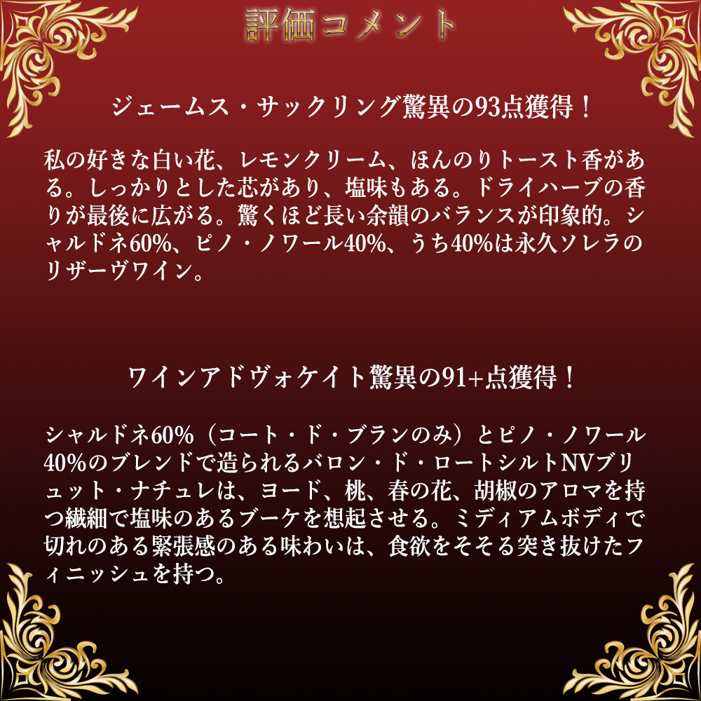 【商品説明】入手困難!高級シャンパーニュ愛好家大注目!バロン・ド・ロスチャイルドのドサージュ0g/Lの最辛口ブリュット・ナチュール!グラン・クリュとプルミエ・クリュのブドウを使用し、4年以上の瓶内熟成を経て完成した非常に贅沢なシャンパーニュ!世界的に高名なボルドーの3つのロスチャイルド家が総力を尽くして造る、至高のプレスティージュ・シャンパーニュ! バロン・ド・ロスチャイルド家250年の栄華を象徴する特別なシャンパーニュの10周年を記念して、ムートン・ロスチャイルド、ラフィット・ロスチャイルド、シャトー・クラークを所有するファミリー(シャトー・ムートン・ロスチャイルドを所有するバロン・フィリップ・ド・ロスチャイルドをはじめとする、三社のロスチャイルドファミリー)が、一家のこれまでの功績とロスチャイルド家の精神的価値を代表するシンボルとして手掛けるシャンパーニュ、バロン・ド・ロスチャイルド!リリース直後から世界的なワイン評価誌でも高評価を獲得し、人気漫画「神の雫」にも登場するほど高い注目を浴びています! このバロン・ド・ロスチャイルド・シャンパーニュ・ブリュット・ナチュールは、グラン・クリュとプルミエ・クリュの畑のブドウを使用し、4年以上の瓶内熟成を経て完成した非常に贅沢なシャンパーニュ!バロン・ド・ロスチャイルドが手掛ける他のシャンパーニュに比べてシャルドネの比率が高いのが特徴!手摘みによって収穫されたブドウ(シャルドネ60%&ピノ・ノワール40%)を使用!フレッシュさとフィネスを保つために温度管理がされたタンクにて約2週間発酵!さらに最低でも3年間熟成させたリザーヴワイン(秘伝のタレのようなもの)を贅沢にも40%使用しており、そこからさらに4年間澱と共に熟成!ドサージュは0g/Lの最辛口仕上げで、ドライでフレッシュな味わいが魅力で、熟成による滑らかな質感が感じられます! ジェームス・サックリング驚異の93点でコメントは「私の好きな白い花、レモンクリーム、ほんのりトースト香がある。しっかりとした芯があり、塩味もある。ドライハーブの香りが最後に広がる。驚くほど長い余韻のバランスが印象的。シャルドネ60%、ピノ・ノワール40%、うち40%は永久ソレラのリザーヴワイン。」! ワインアドヴォケイト驚異の91+点でコメントは「シャルドネ60%(コート・ド・ブランのみ)とピノ・ノワール40%のブレンドで造られるバロン・ド・ロートシルトNVブリュット・ナチュレは、ヨード、桃、春の花、胡椒のアロマを持つ繊細で塩味のあるブーケを想起させる。ミディアムボディで切れのある緊張感のある味わいは、食欲をそそる突き抜けたフィニッシュを持つ。」! 外観は輝きのある黄金色の色調!レモンや洋ナシなどの果実のアロマに、繊細なトーストやブリオッシュの香りが広がります!ドライな口当たりで、シャルドネ由来のフレッシュかつピュアな味わいが印象的!フィニッシュに訪れる、エネルギッシュでありながら軽やかな余韻に魅了させられます! バロン・ド・ロスチャイルド渾身の究極ノン・ドゼ・シャンパーニュ!至高のシャンパーニュが正規品で極少量入荷!
