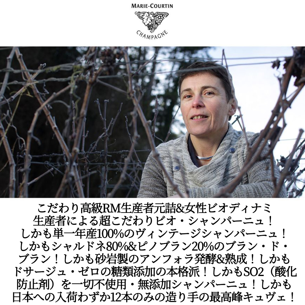 【商品説明】希少!超入手困難!最高級・自然派・R.Mシャンパーニュ辛口愛好家大注目!こだわり最高級RM生産者元詰&女性ビオディナミ生産者による超こだわりビオ・シャンパーニュ!しかも単一年産100%のヴィンテージシャンパーニュ!しかも砂岩製のアンフォラ発酵&熟成!しかもドサージュ・ゼロの糖類添加の本格派!しかもSO2(酸化防止剤)を一切不使用・無添加シャンパーニュ!しかも日本への入荷わずか12本のみの造り手の最高級最高峰キュヴェ! 毎年世界の注目を集める、「Bulles et Millesimes/ビュル・エ・ミレジム」誌主催のトロフェ・シャンプノワ2024年にてRM部門の 「ヴィニュロン・オブ・ザ・イヤー」を受賞の快挙!さらに大人気のマリー・クルタンがエペルネで開催されたトロフェ・シャンプノワ (Tout le palmares des Trophees Champenois 2024度) にて、Vigneron (ne) de l’annee(年間最優秀栽培家) 賞を受賞の快挙!! 銘醸地オーブのポリゾ村から、女性ビオディナミ生産者による超こだわりビオ・シャンパーニュ!しかも砂岩製のアンフォラ発酵&熟成!しかも単一年産100%のヴィンテージシャンパーニュ! しかも (フランソワーズ・ベデルを彷彿とさせる女性ビオディナミ生産者が、オーブに誕生しました。挑むはオーブの魂、ピノ・ノワール100%によるブラン・ド・ノワール) 当主のドミニク・モロー女史は、「DRC=ドメーヌ・ド・ラ・ロマネ・コンティ」、「ルフレーヴ」、「コント・ラフォン」らにビオディナミを教えた、巨匠ピエール・マッソンに直接師事!ポリゾ村のR.M.ピオロ・ペール・エ・フィスに嫁いでオーブに来てからは、シャンパーニュにおけるビオディナミの先駆者ジャン・ピエール・フルーリーや、ベルトラン・ゴートロらとの交友を育みながら、マリー・クルタンの名でスタート! ずばりマリー・クルタンによる超限定生産!有機栽培シャンパーニュ・ブラン・ド・ブラン (シャルドネ80%&ピノブラン20%のブラン・ド・ブラン)・エクストラ・ブリュット (ドサージュ・ゼロ) !銘醸地オーブのポリゾ村から女性ビオディナミ生産者による超こだわり!しかも身体にやさしい酸化防止剤のSO2無添加!のヴァンナチュール!しかもAB&エコセール認定自然派ビオシャンパーニュ!しかもシャルドネ80%、ピノ・ブラン20%のブラン・ド・ブラン。ポリゾ村の100%マス選抜による区画より。平均樹齢30年のVV。収量は35hl/ha。2020年産100%の単一年産100%のヴィンテージシャンパーニュ。砂岩製のアンフォラで発酵後、9ヶ月間熟成。ドザージュはゼロ。 作品名の「マニガンス」は「ちょっとした策謀」という意味で、この生産者の最上位のブラン・ド・ブランであるこの作品に、敢えてピノ・ブランを20%ブレンドしていることを表しています。ドミニク・モロー女史渾身の作!造り手最高峰の単一年産100%の究極ブラン・ド・ブラン・エクストラ・ブリュットが限定で現地のセラー数ヶ月前の蔵出し作品で極少量入荷! (日本への入荷入手困難!なわずか12本のみ) シャンパーニュ愛好家はお急ぎ下さい!