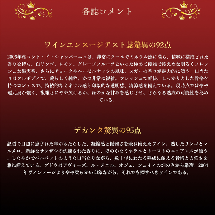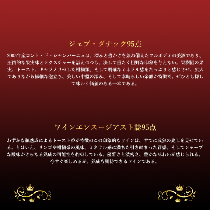 【商品説明】入手困難!高級シャンパーニュ辛口愛好家垂涎!テタンジェ最高峰コント・ド・シャンパーニュの希少20年熟成ものが奇跡の極少量入荷!フランスおよび世界の一流レストランの極上ワインリストのそのほとんどに登場!フランス大統領の公式レセプションにも用いられる大人気高級ブランドブラン・プレステージヴィンテージシャンパーニュ! ワイン評論家のヒュー・ジョンソン氏に「絹のようにやわらかく、花のかぐわしさを感じさせる。」と絶賛させたテタンジェの最高峰!シャルドネの聖地、コート・デ・ブランのシャルドネ (特級アヴィーズ、特級シュイイ、特級クラマン、特級メニル・シュール・オジェ、特級オジェ) コート・デ・ブラン地区のグラン・クリュ (特級畑) に認定された5つの村で収穫されたシャルドネのみを100%使用!しかも一番搾り果汁100%使用!エレガントで洗練されたスタイルのシャンパン造りで定評!ずばり世界中の専門家たちが賞賛する、優美で繊細なシャンパーニュ!しかもメゾン最高峰!最高級のブラン・ド・ブラン・スペシャル・キュヴェ!「シャンパーニュ伯爵 (チボーIV世) 」の名を授かる究極ヴィンテージ・ブラン・ド・ブラン高級シャンパーニュ!コント・ド・シャンパーニュ! ロバート・パーカー氏は★★★★4つ星生産者に挙げ、なんと!この最新ヴィンテージ2012年のコント・ド・シャンパーニュにワインアドヴォケイト誌驚異の92点の高評価で『2005年産コント・ド・シャンパーニュは、非常にクールでミネラル感に満ち、精緻に構成された香りを持ち、白リンゴ、レモン、グレープフルーツといった極めて優雅で控えめな明るくフレッシュな果実香、さらにチョークやヘーゼルナッツの風味、ヌガーの香りが魅力的に漂う。口当たりはフルボディで、愛らしく純粋、かつ非常に複雑。フレッシュで軽快、しっかりとした骨格を持つコンテスで、持続的なミネラル感と印象的な透明感、清涼感を備えている。現時点ではやや還元臭が強く、複雑さにやや欠けるが、ほのかな甘みを感じさせ、さらなる熟成の可能性を秘めている。』と大注目! デカンタ驚異の95点でコメントは『温暖で日照に恵まれた年がもたらした、凝縮感と優雅さを兼ね備えたワイン。熟したリンゴとマルメロ、新鮮なサンザシの洗練された香りに、ほのかなミネラルとトーストのニュアンスが漂う。しなやかでベルベットのような口当たりながら、数十年にわたる熟成に耐える骨格と力強さを兼ね備えている。ブドウはアヴィーズ、ル・メニル、オジェ、シュイィの畑のみから厳選。2004年ヴィンテージよりやや柔らかい印象ながら、それでも探すべきワインである。』! ジェブ・ダナック95点でコメントは「2005年産コント・ド・シャンパーニュは、深みと豊かさを兼ね備えたフルボディの美酒であり、圧倒的な果実味とテクスチャーを湛えつつも、決して重たく粗野な印象を与えない。果樹園の果実、トースト、キャラメリゼした柑橘類、そして明確なミネラル感をたっぷりと感じさせ、広大でありながら繊細な泡立ち、美しい中盤の深み、そして素晴らしい余韻が特徴だ。ぜひとも探して味わう価値のある一本である。」! ワインエンスージアスト誌95点でコメントは「わずかな瓶熟成によるトースト香が特徴のこの印象的なワインは、すでに成熟の兆しを見せている。とはいえ、リンゴや柑橘系の風味、ミネラル感に満ちた引き締まった質感、そしてシャープな酸味がさらなる熟成の可能性を約束している。優雅さと濃密さ、豊かな味わいが感じられる。今すぐ楽しめるが、熟成も期待できるワインである。」! ル・クラスマン誌 (現レ・メイユール・ヴァン・ド・フランス誌) に「偉大なブラン・ド・ブランを一本だけ選ぶとしたら間違いなくテタンジェの「コント・ド・シャンパーニュ」になるだろう」と断言させた単一年産100%の大人気ミレジメ2005年!しかも一番搾り果汁100%を使用の贅沢なキュヴェ!一部をオークの新樽100%で熟成させることで、トーストのニュアンスを加えています。真にエキサイティングな最高峰ブラン・ド・ブラン!まさに「シャンパーニュの貴婦人」と呼ばれるのに相応しい逸品! サン=ニケーズ修道院の旧石切場のカーヴで10年間以上の眠りの後のリリース!上質な白い果実と白い花の気品のある香り、長期熟成ならではのキメ細かな泡立ちと滑らかな舌触り!洗練された花やハチミツのアロマ!焼きたてのパンやブリオッシュの風味!口に含むと滑らかで生き生きとし、グレープフルーツとかすかなスパイスの風味が素晴らしく複雑に絡み合う余韻の長さも一流を感じさせてくれるテタンジェの至宝!洗練された味わいが特長の究極辛口ブラン・ド・ブランが非常に珍しい20年熟成の秘蔵[2005]年もので限定少量入荷!