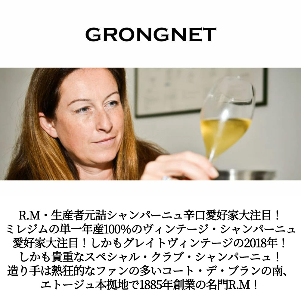 【商品説明】入手困難!R.M・生産者元詰シャンパーニュ辛口愛好家大注目!ミレジムの単一年産100%のヴィンテージ・シャンパーニュ愛好家大注目! しかもグレイトヴィンテージの2018年!しかも貴重なスペシャル・クラブ・シャンパーニュ愛好家垂涎!アシェット・ガイド誌も大注目! シャンパーニュ愛好家のバイブルとも言われるRichard Juhlinの「4000シャンパーニュ」でもこのスペシャル・クラブの1996年ものが高評価で絶賛!しかも希少!R.Mシャンパーニュ!の蔵出し限定作品! 造り手はコート・デ・ブランの南、エトージュ本拠地で1885年創業の名門R.M!で熱狂的な愛好家をファンに持つ人気シャンパーニュで、その生産量の大半がモエ・エ・シャンドンにブドウで提供 (直行!) 残りのドメーヌ自社瓶詰め分もフランスの熱狂的な個人シャンパン愛好家に直行してしまうため、リリース直後に即完売! (発売前から予約殺到!) の入手困難R.M (生産者元詰) グロンニェ・シャンパーニュ! しかも貴重で大人気の限定品の“スペシャル・クラブ”!(「Special Club」は、RM(自家栽培したぶどうで自らシャンパーニュを造る独立系生産者)の振興団体「Club Tresors de Champagne」に加盟する26のRMが、素晴らしいできの年 (良年) に限って仕込む「ミレジム」を、共通のボトル(昔のシャンパーニュのボトル形状に着想を得た独自の重厚ボトル)および共通のラベルデザインによって展開する特別プロジェクトです。「ミレジム2004」のリリースに際し、16年ぶりにラベルデザインが一新され、よりシックでエレガントな外観となりました。(同プロジェクトの最初のミレジムは1971年(!)で、1988年にラベルデザインが変わり、さらに今回の改定で4度目の改定となります)。 「グロンニェ」の作品は、ピノ・ノワール57%(ステンレスタンクで醸造)、シャルドネ43%(木製の大樽(33hl)で醸造)のブレンドで、マロラクティック発酵は行っておりません。ドザージュは6g/l。) しかもグロンニェさんのセラーから特別にお分けいただいた蔵出し作品の最高の状態の最高ヴィンテージ・シャンパーニュが現地のセラー数ヶ月前の蔵出し作品で限定で極少量入荷!