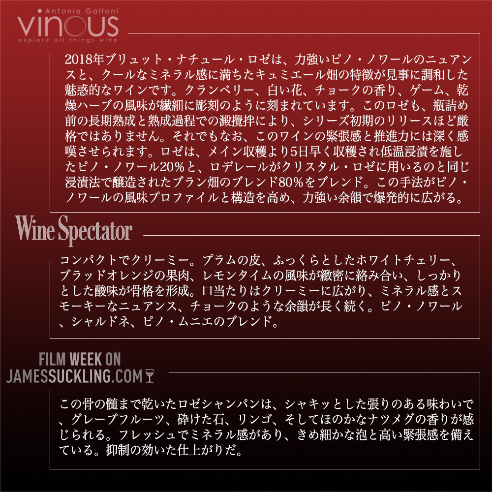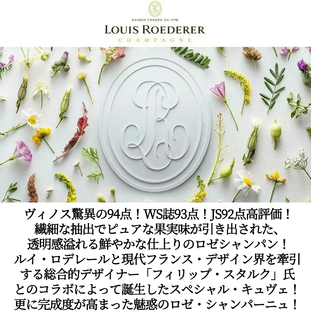 【商品説明】高級ロゼ・シャンパーニュ辛口愛好家大注目!単一年産100%ミレジム・シャンパーニュ愛好家大注目! 高級シャンパーニュ「クリスタル」で有名な、ロシア皇帝アレキサンドル二世がこよなく愛したとして有名なルイ・ロデレール (1766年にデュボア・ペール・エ・フィスとして設立され、1883年から「ルイ・ロデレール」の名で現在に至る) !からルイ・ロデレールと現代フランス・デザイン界を牽引する総合的デザイナー「フィリップ・スタルク」氏とのコラボレーションによって誕生したスペシャル・キュヴェ!「ブリュット・ナチュール・ロゼ・フィリップ・スタルク」! 日本ではあの浅草の「スーパードライホール」でも有名なフィリップ・スタルクですが、ルイ・ロデレールでは、新たに発見された優良区画から特別なシャンパーニュを造るべく2003年からこのプロジェクトを極秘ですすめていたそうで、社長のフレデリック・ルゾー氏もメゾンの歴史に新たな1ページを刻むような斬新な試みとしてこのプロジェクトに参加! しかも、フィリップ・スタルク氏自身が「シャンパーニュはノン・ドザージュのものしか飲まない」と公言しているためノン・ドザージュ (ブリュット・ナチュール) でのリリース! しかもこのミレジメ2018年からエチケットも刷新されて登場!しかも高評価グレイトヴィンテージ (アシェットガイド誌2026年版が17/20点&WA92点をつけるグレイトヴィンテージ) の最高人気のひとつ[2018]年もの! 『どこまでもピュアでシンプル、削ぎ落とされた美しさを追求した無垢な1本』! プルミエ・クリュであるキュミエール村の素晴らしいテロワールを生かすため、暑く乾燥した年にのみ造られるのが特徴!気候変動に対応する挑戦の先端を行く「未来のシャンパーニュ」でもあり、ルイ・ロデレールの中でも最もモダンな1本!繊細な抽出でピュアな果実味が引き出された、透明感溢れる鮮やかな仕上がりのロゼ・シャンパーニュ! この2018年でヴィノス誌驚異の94点でコメントは『2018年ブリュット・ナチュール・ロゼは、力強いピノ・ノワールのニュアンスと、クールなミネラル感に満ちたキュミエール畑の特徴が見事に調和した魅惑的なワインです。クランベリー、白い花、チョークの香り、ゲーム、乾燥ハーブの風味が繊細に彫刻のように刻まれています。このロゼも、瓶詰め前の長期熟成と熟成過程での澱攪拌により、シリーズ初期のリリースほど厳格ではありません。それでもなお、このワインの緊張感と推進力には深く感嘆させられます。ロゼは、メイン収穫より5日早く収穫され低温浸漬を施したピノ・ノワール20%と、ロデレールがクリスタル・ロゼに用いるのと同じ浸漬法で醸造されたブラン畑のブレンド80%をブレンド。この手法がピノ・ノワールの風味プロファイルと構造を高め、力強い余韻で爆発的に広がる。』! ワインスペクテーター93点でコメントは『コンパクトでクリーミー。プラムの皮、ふっくらとしたホワイトチェリー、ブラッドオレンジの果肉、レモンタイムの風味が緻密に絡み合い、しっかりとした酸味が骨格を形成。口当たりはクリーミーに広がり、ミネラル感とスモーキーなニュアンス、チョークのような余韻が長く続く。ピノ・ノワール、シャルドネ、ピノ・ムニエのブレンド。』! ジェームス・サックリング92点でコメントは『この骨の髄まで乾いたロゼシャンパンは、シャキッとした張りのある味わいで、グレープフルーツ、砕けた石、リンゴ、そしてほのかなナツメグの香りが感じられる。フレッシュでミネラル感があり、きめ細かな泡と高い緊張感を備えている。抑制の効いた仕上がりだ。』! 2018年について副社長兼醸造責任者のジャン・バティスト・レカイヨン氏は「2018年は、土壌と造り手によって形作られた、例外的な歴史に残る年です。フルーティーで非常に率直な、しなやかさと心地良さを備えた非常に滑らかなワインを生み出しました」と自ら激賞! 外観は輝きのあるサーモンピンクの色合い!クリーミーできめ細やかな泡が立ち上ります!しっかりと熟した赤スグリやブラッドオレンジ、バラの花びらやオレンジピールなどのアロマから始まり、グラスを回すと微かにラズベリーのリキュールを思わせる香りに変化!口に含むと、まるでしっかりと熟した果実をかじったような印象で、新鮮で凝縮感のある果実味が口いっぱいに広がります!余韻にはミネラル感やヨード香、スパイスの風味が心地良いタンニンと共に長く持続!ブドウの本来のピュアさを表現しつつ、伸びやかな酸と熟度の高いピノ・ノワール由来の骨格を備えたバランスの高さは唯一無二のスタイルで、ノン・ドザージュとは思えないほどの仕上がり! 2015年ヴィンテージから更に完成度が高まった、魅惑のロゼ・シャンパーニュに進化したブリュット・ナチュール・ロゼ・フィリップ・スタルクが高評価[2018]年で正規代理店輸入品で限定で少量入荷!
