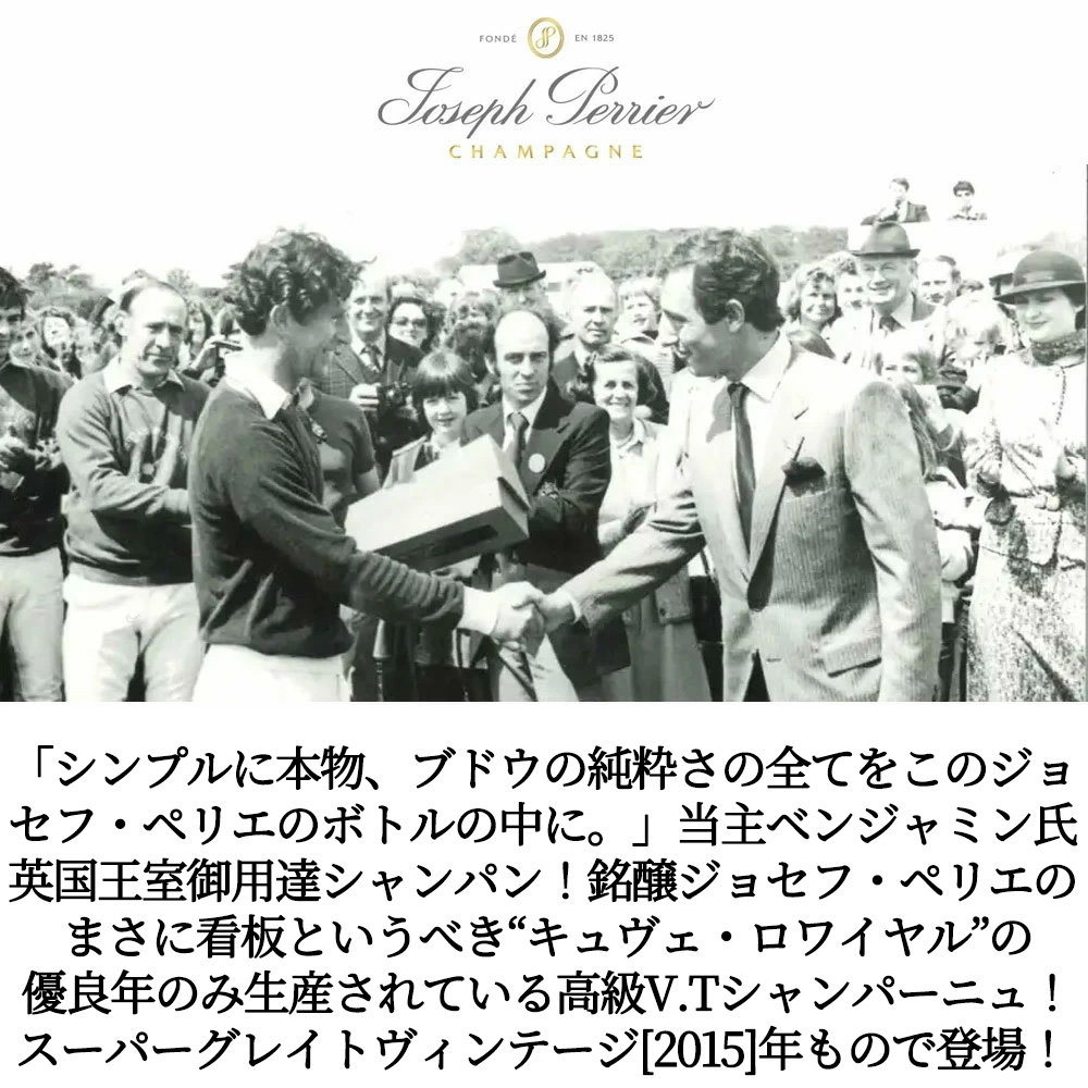 【商品説明】高級シャンパーニュ愛好家大注目!高級ミレジム・シャンパーニュ愛好家大注目!英国王室御用達シャンパーニュ!ジョセフ・ペリエ」しか飲まなかったと言われるヴィクトリア女王、エドワード七世から「ロワイヤル」の称号を受け、シャンパーニュ・キュヴェ名の中に“ロワイヤル”が使われている究極シャンパーニュ!現在でもチャールズ皇太子やアンドリュー皇子の結婚式などの指定シャンパーニュとして有名! ロバート・パーカー4つ星生産者!ゴーミヨ誌4つ星、ミシェル・エドワーズ「シャンパーニュ」3つ星!ル・クラスマン誌にクリュッグやボランジェに次ぐ★★(ダブルスター)評価をさせ、「実にまろやかなシャンパーニュ。味にうるさい通を唸らせるような切り札をそろえているといってもいい」と絶賛させた人気シャンパーニュ、“キュヴェ・ロワイヤル”の優良年のみ生産される高級ヴィンテージ・シャンパーニュ!しかもグレイトヴィンテージ[2015]年(アシェットガイド誌2024年版ではシャンパーニュに17/20点のグレイトヴィンテージ評価(これは伝説の1985年や1966年、1970年、2002年と同評価)!WAでは驚異の93点のグレイトヴィンテージ)! この“キュヴェ・ロワイヤル”ヴィンテージは、シャルドネ50%、ピノ・ノワール41%、ピノ・ムニエ9%(ル・メニル・シュール・オジェやシュイイ、キュミエール、マイィ・シャンパーニュ、リリー・ラ・モンターニュ、サシィなどの自社畑を含むグラン・クリュとプルミエ・クリュの畑のぶどうを使用)温度管理されたステンレスタンクでアルコール発酵後マロラクティック発酵!瓶内二次発酵後、最低でも約6年間熟成!デゴルジュマン(澱抜き)の後、門出のリキュール添加!2015年についてメゾンは「2015年は非常に気温が高く、干ばつに見舞われ、何度か強烈な雨にも降られた特徴的な気候が生み出した卓越したヴィンテージ」! セラーマスターのナタリー・ラプレイジュによるティスティングコメントは「やや深みのある輝きを放つゴールドに、エレガントなシルバーのハイライト。香りの第一印象はフルーティーなブラッド・オレンジで、すぐにドライフルーツのアロマへと変化する。生き生きとしたアタックで、ジンジャーの美しいノートが広がる。味わいは洗練され、ミネラルと塩のニュアンスへと変化する。フィニッシュは蜂蜜風味。」! 美しいムースのような泡立ち輝くゴールド色!香りは深みがあり、アカシアやニワトコ、オレンジの花などの白い花の香りに続けて、グレープフルーツやパイナップル、ぶどうが感じられます!口に含むとフルボディで凝縮感があり、繊細な果実の風味(ぶどうのゼリーや、パイナップル、紅茶で煮たプルーンなど)も感じられます!余韻は長く続き、甘いはちみつやアーモンド、ヴァニラやオレンジフラワーなどの柔らかいヌガーの風味があります! 豊かな果実味とフレッシュさもあるので、ヴァニラオイルとブルボン産の胡椒を使ったホタテのカルパッチョ、フォアグラ、洋ナシのポワール・ウィリアムのフレンチメレンゲ添えなどと相性抜群!特にイギリスとアメリカで高く評価されている大人気ミレジム・シャンパーニュが、スーパーグレイトヴィンテージ[2015]年もので正規代理店輸入品で待望の少量入荷!