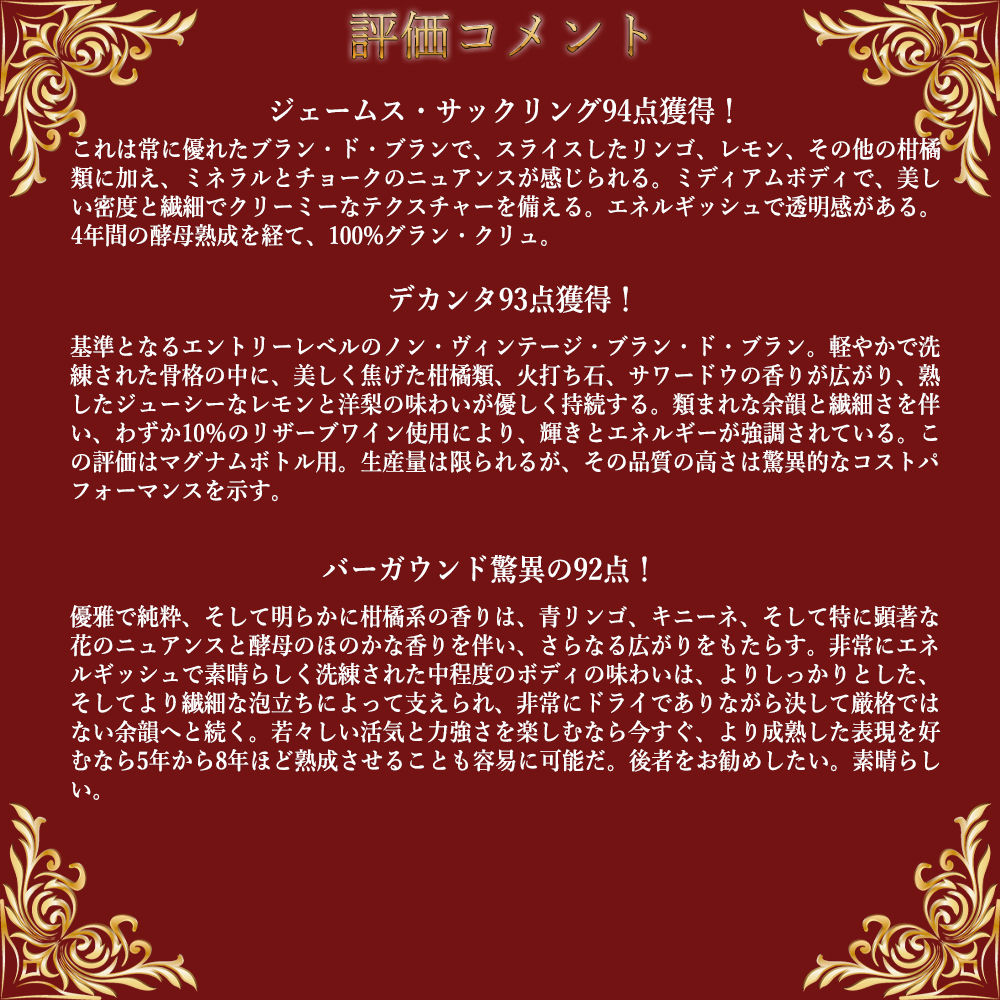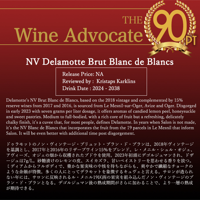【商品説明】シャンパーニュ愛好家大注目!あの高級シャンパーニュ“サロン”の姉妹メゾン!あのシャルドネ種の特質を十二分に引き出したシャンパーニュづくりを得意とする究極メゾン!“ドゥラモット”!なんとサロンが造られない年は、サロン用のワインはこのドゥラモットに使われると言われます!しかもスタンダードのブリュットのワンランク上!しかもコート・デ・ブラン100%!グラン・クリュ格付(特級)のシャルドネ100%の究極ブラン・ド・ブラン!しかも6年前後の長期熟成を経た大人気ブリュット! ロバート・パーカー氏は、3-4つ星生産者に挙げ、ワインアドヴォケイトはブラン・ド・ブラン・ブリュットに堂々90点高評価(2024年12月号)で、コメントは『ドゥラモットのノン・ヴィンテージ・ブリュット・ブラン・ド・ブランは、2018年ヴィンテージを基調とし、2017年と2016年のリザーブワイン15%をブレンド。レ・メニル・シュル・オジェ、アヴィーズ、オジェの畑から収穫されたブドウを使用。2023年初頭にデゴルジュマンされ、ドザージュは7g/L。砂糖漬けのレモンの皮、スイカズラ、甘いペイストリーを思わせる香りを放つ。ミディアムからフルボディで、豊かな果実味の中核を持ちながらも、爽やかで繊細なチョークのような余韻が特徴。多くの人にとってデラモットを象徴するキュヴェと言える。サロンが造られない年には、サロンに反映されるル・メニル19区画の果実を組み込んだノン・ヴィンテージのブラン・ド・ブランとなる。デゴルジュマン後の熟成期間がさらに加わることで、より一層の熟成が期待できる。』と大注目! ジェームス・サックリング94点(2024年8月)でコメントは『これは常に優れたブラン・ド・ブランで、スライスしたリンゴ、レモン、その他の柑橘類に加え、ミネラルとチョークのニュアンスが感じられる。ミディアムボディで、美しい密度と繊細でクリーミーなテクスチャーを備える。エネルギッシュで透明感がある。4年間の酵母熟成を経て、100%グラン・クリュ。』! デカンタ93点(2024年4月)でコメントは『基準となるエントリーレベルのノン・ヴィンテージ・ブラン・ド・ブラン。軽やかで洗練された骨格の中に、美しく焦げた柑橘類、火打ち石、サワードウの香りが広がり、熟したジューシーなレモンと洋梨の味わいが優しく持続する。類まれな余韻と繊細さを伴い、わずか10%のリザーブワイン使用により、輝きとエネルギーが強調されている。この評価はマグナムボトル用。生産量は限られるが、その品質の高さは驚異的なコストパフォーマンスを示す。』と大注目! さらにバーガウンドでさえ驚異の92点(2024年10月)でコメントは『優雅で純粋、そして明らかに柑橘系の香りは、青リンゴ、キニーネ、そして特に顕著な花のニュアンスと酵母のほのかな香りを伴い、さらなる広がりをもたらす。非常にエネルギッシュで素晴らしく洗練された中程度のボディの味わいは、よりしっかりとした、そしてより繊細な泡立ちによって支えられ、非常にドライでありながら決して厳格ではない余韻へと続く。若々しい活気と力強さを楽しむなら今すぐ、より成熟した表現を好むなら5年から8年ほど熟成させることも容易に可能だ。後者をお勧めしたい。素晴らしい。』と激賞! ベタンヌ&ドゥソーヴの「ル・グラン・ギド・デ・ヴァン・ド・フランス」誌では、2B&Dマークでこのブラン・ド・ブランに「エスプリと躍動感豊かでもちろん才気も豊か!繊細でとてもアペリティフ向けのブラン・ド・ブランを代表するようなキュヴェ」として高評価! 250年にもおよび伝統とシャルドネ種にこだわる姿勢を貫く究極メゾンによる、コート・デ・ブラン・グラン・クリュならではのブレのない研ぎ澄まされた酸とミネラルに果実味が高い次元で調和したデリケートでピュアな風味の超人気“ドゥラモット”の究極ブラン・ド・ブランが正規品で限定で極少量入荷!