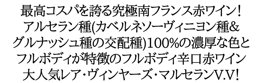 ![]() レア・ヴィンヤーズ・マルセラン・ヴィエイユ・ヴィーニュ[2023]年 ぶどう品種:アルセラン種100% LGI社は国際的なワインコンテスト 「ベルリンワイントロフィー」 において3年連続で 「ベスト・フランスワイン・プロデューサー賞」を受賞! マルセランはカベルネソーヴィニヨンと グルナッシュの交配種で濃厚な色と凝縮感が特徴! このレア・ヴィンヤーズ・マルセラン・ヴィエイユ・ヴィーニュは ミネルヴォワ地区の標高50mの8haの石の多い粘土石灰質土壌の畑。 (地中海性気候)の平均樹齢15~20年のマルセラン種をギュイヨ仕立て! 植密度3,500本/ha!9月中・下旬に収穫!醸造はコンクリートと ステンレスタンクにて熟成&発酵(25 30℃で10日間の発酵。 更に5 10日間の果皮浸漬。樽不使用。) で造られる熟した 黒果実のアロマにスパイシーなニュアンス! ジューシーでフルボディな辛口赤ワイン! |