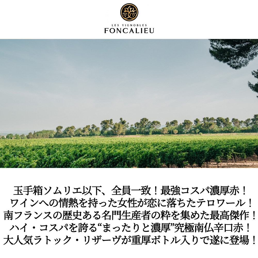【商品名】ラトック・リザーヴ[2021]年・レ・ヴィニョーブル・フォンカリユ(まったり濃厚・甘味・チョコレートの様な風味)ワインへの情熱を持った女性が恋に落ちたテロワールからのぶどう使用・2018VTでサクラアワードダブルゴールドメダル受賞酒【英名】Latoque Reserve [2021] Les Vignoble Foncalieu IGP Pay d'oc (Cabernet sauvignon & Syrah & Malbec)SAKURA Japan Women's Wine Awards 2020 W gold