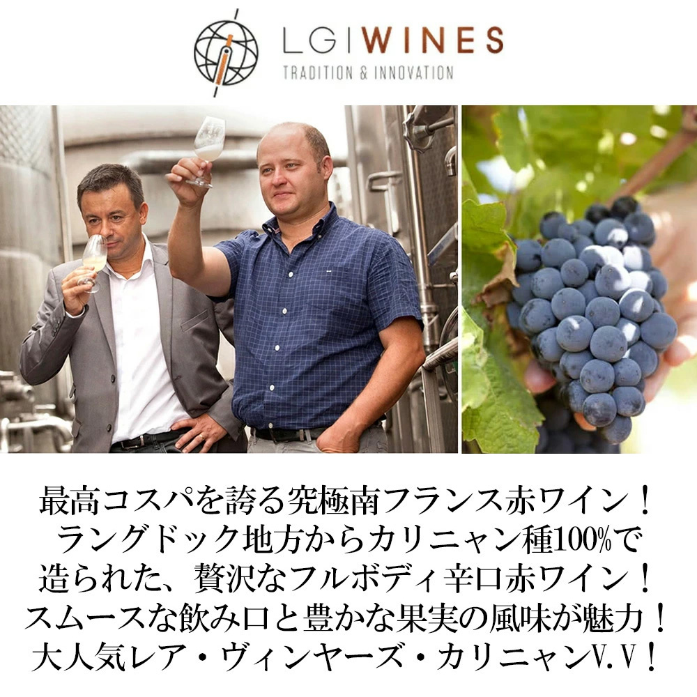 【商品説明】フランス・フルボディ辛口赤ワイン愛好家大注目!ラングドック・ルーション地方からカリニャン種100%で造られた贅沢なフルボディ辛口赤ワイン! 造り手は海外市場で高い評価を受けるラングドックの「LGI社」!LGI社は、1999年、アラン・グリニョン氏によってラングドック地方のカルカッソンヌに設立された企業で大規模な生産者組合のひとつ!エクスポートマネージャーの経験を持ち、革新的なワインの造り手でもあったアラン氏は、この地のテロワールとブドウの個性を見事に表現し、かつ市場のニーズを上手く捉えた数々のベストセラーワインを生みました。LGI社は国際的なワインコンテスト「ベルリンワイントロフィー」 において3年連続で「ベスト・フランスワイン・プロデューサー賞」を受賞!このワインの2020VTで、レア・ヴィンヤーズ・カリニャン・ヴィエイユ・ヴィーニュでベルリンワイントロフィー2019にて金賞受賞! ラングドックのエロー地区の標高100m!南向きの畑!白亜粘土質土壌!低収量かつ樹齢45年の平均樹齢45年の古木のカリニャン種100%!植密度4,000本/ha!9月中・下旬に収穫!醸造はコンクリートとステンレスタンクにて熟成&発酵(26度で7日間の発酵と2週間の醸し)で造られるスムースな飲み口と豊かな果実の風味が様々な料理にマッチする究極フルボディ辛口赤ワインが限定でリーズナブルプライスで限定入荷!