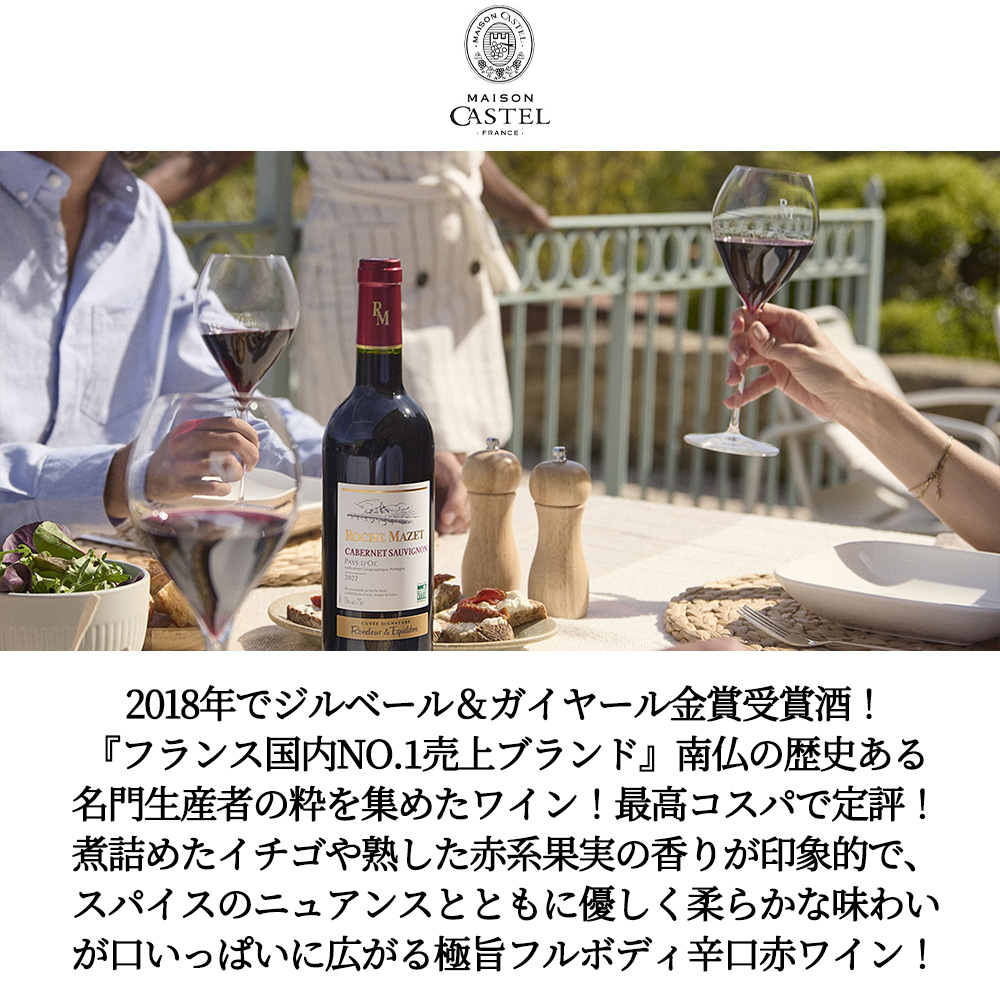 【商品説明】南フランス辛口赤ワイン愛好家大注目!南仏メルロー辛口赤ワイン愛好家大注目!ジルベール&ガイヤールゴールドメダル金賞受賞酒のメルロー辛口赤ワイン! しかもこのロシュ・マゼ・ブランドは『フランス国内NO.1売上ブランド』!南仏の歴史ある名門生産者の粋を集めたワイン!1990年代後半、フランスのワインマーケットの大半はAOCワインで、ヴァラエタルワインを商品棚に見つけることは難しいことでした!ここに着目をしたのが、醸造家のトマ・ランクレ氏!彼はヴァラエタルワインに特化したブランドを考えました!1998年、ロシュ・マゼが誕生!まずはじめに彼が目指したことは、樽を効かせたスタイルのワインを購入しやすい価格で造ること!そしてパッケージングはすべてのフランス人に親しみのある、ボルドーグランヴァンのスタイル!を基本とすることでした!ヴァラエタルワインという新しい商品と伝統的なボルドースタイルのパッケージング、この融合がバイヤーたちの関心、そしてフランスの消費者の心を引き付けました! 造り手のカステルグループは、ボルドー・プロヴァンス・ラングドック・ロワール各地方に数々のシャトーやドメーヌを所有(オーメドックにクリュブルジョワ級のシャトー・バレールを自社所有。メドック格付けのシャトーベイシュヴェルはバリエール社としてS社と共同所有。ブルゴーニュのパトリアッシュや1725年創業、ボルドーで最も歴史あるワイン商・バルトン・エ・ゲスティエなど)さらにフランス国内に約500店舗、海外に50店舗以上を展開するワイン小売りチェーン『Nicolas ニコラチェーン』もグループのひとつ! 「ロシュ・マゼ」の名前の由来は「ROCHE(ロシュ)」がペイ・ドック地方のテロワールである粘土石灰質土壌に由来し、「MAZET(マゼ)」は南フランスでよく見られる“小屋”を意味します!ブランド名からテロワールの特徴、そしてどこで造られているかが分かります!この地方の丘陵地は粘土石灰質で石ころの多い土壌ですが、その中でも最良の区画で生まれたワインを厳選することで特別なロシュ・マゼのブレンドが実現しています! 厳選したメルロー種85%にカベルネ・ソーヴィニヨン15%で造られる、このロシュ・マゼ・メルローは、煮詰めたイチゴや熟した赤系果実の香りが印象的で、スパイスのニュアンスとともに優しく柔らかな味わいが口いっぱいに広がる極旨フルボディ辛口赤ワイン! 多彩な料理とのマリアージュ、例えば、すき焼きをはじめとしたお肉料理やうなぎの蒲焼などとのマリアージュは最高です!