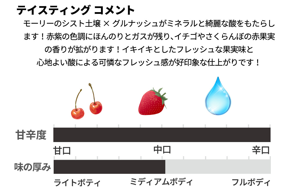 【商品説明】南フランスのルーション地方から大人気のパッション!ブドウがそのままワインになったような果実味!しかも【毎年変わるかわいいラベル】が大人気!また《リアルワインガイド誌15号》の表紙に登場!&《リアルワインガイド誌28号》『極めつけのおすすめ30本』に掲載!&《リアルワインガイド誌63号》『旨安大賞ワインは今も旨安大賞ワインだった』と絶賛!南フランスのラングドック&ルーション地方はフランスで最古のワイン産地で、現在でもフランス全土の3分の1のワインを生産しています!ルーション地方の土壌はシスト土壌と粘土石灰というテロワールですが、このシスト土壌とは、石のミルフィユのような感じで、崩れ易い薄いスレート状の層が重なっている地層でブドウの根がそれを突き抜けて地中深く伸びていき、鉄分などのミネラルを豊富に吸収します!このシスト土壌とそこに植えられたグルナッシュ種の組み合わせこそシンプルでルーズになりやすいグルナッシュが、ここでは別次元のミネラル感を見せ、上品で緻密な味わいとなります!グルナッシュ本来の果実味とシスト土壌ならではの綺麗な酸とミネラルが絶妙のハーモニーを奏でます!ラ・パッション・グルナッシュは、平均樹齢60年のグルナッシュ種100%を手摘み100%!40hlのセメントタンクで発酵・熟成!SO2は少量添加(トータルわずか60mg/L)で造られる南仏ルーションで生まれる旨安ワインの代表格!パッション=情熱、ヴィンテージ毎に変わる「太陽君」のエチケットが話題です!モーリーのシスト土壌×グルナッシュがミネラルと綺麗な酸をもたらします!赤紫の色調にほんのりとガスが残り、イチゴやさくらんぼの赤果実の香りが拡がります!イキイキとしたフレッシュな果実味と心地よい酸による可憐なフレッシュ感が好印象な仕上がりです!