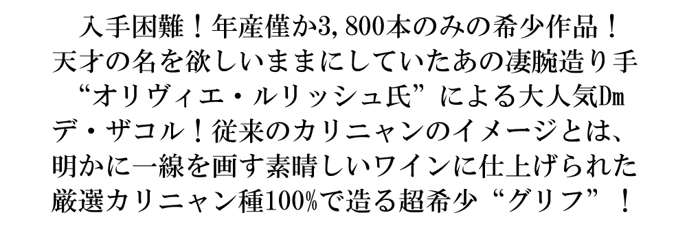 ![]() グリフ[2020]年・蔵出し品・ドメーヌ・デ・ザコル元詰・(元ドメーヌ・ラルローの醸造責任者ローレンス&オリヴィエ・ルリッシュ家)・カリニャン100%・(樹齢60年の古木のヴィエイユ・ヴィーニュ)・自然派ビオ(AB&デメテール認証&FRビオ)・正規品 ■ぶどう品種:カリニャン100% ■平均樹齢:60年以上 ■土壌:粘土石灰質土壌 入手困難!年産僅か3,800本のみの希少作品!南フランス辛口赤ワイン愛好家大注目!高級ブルゴーニュ・ドメーヌ・ラルローファン大注目! カリニャン100%ファン大注目!自然派ビオディナミ愛好家大注目!通常のローヌとは一線を画す“エレガント”がキーワード!まずテイスティングでローヌワインとは思えない素晴らしい品質のドメーヌ・ザコル!飲む人を虜にするナチュラルワイン! 出来る限りフィネスがあり、エレガントなスタイルを目指した、従来のカリニャンのイメージとは明らかに一線を画すすばらしいワインに仕上げられた赤ワイン! 凝縮感が高く、タンニンもくっきりとあるが、円みと熟度の高い果実味、伸びのある酸がバランスよく備わっている。フレッシュな酸がとても適度で全体的にとても品のあるスタイル。 重いスタイルではなく、洗練されたワインは料理ととても合います! |