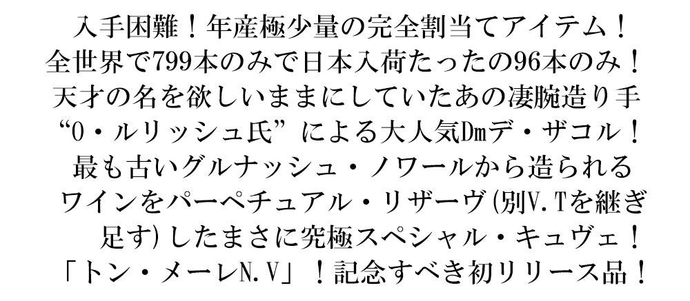 ![]() ドメーヌ・デ・ザコルは、ニュイ・サン・ジョルジュ(ブルゴーニュ)のドメーヌ・ド・ラルロで天才醸造家と謳われたオリヴィエ・ルリッシュと、妻のフロランスが始めたドメーヌ。誰もが羨む地位を捨て夢であった自らのドメーヌを拓いたのです。「ザコル」とは、オック語(中世フランスで使われていたロワール川以南の言葉)で、テラスとかアルデッシュの丘、南ローヌ地方のぶどう畑の丘という意味だそうです。ルリッシュファミリーは2005年に古家を購入し余暇を過ごしていましたが、周辺の畑におけるブルゴーニュとの類似性に気付き、リサーチを重ね、素晴らしい畑と巡り合いました。畑は地理的にはローヌとアルデッシュの峡谷から数kmの所にあり、サン・マルセル・ダルデッシュ県に約18.0haあります。 ![]() ほとんどが樹齢50年以上で粘土石灰質土壌の丘です。ぶどう畑の前所有者は全ての葡萄を共同組合に販売しており、ワインを作っていませんでした。完全な有機農法ではありませんでしたが、きちんとした農薬対策をとっており、過去何年も化学肥料不使用でした。2011年春、オーガニック農法に切り替え(Ecocert認証取得)、2011年10月よりビオディナミ農法の準備を始め、2012年春には、全ての畑がこの農法にて準備が整いました。ラルロでは2000年に農法転換を始め、実際に全ての畑が変換できたのが2003年ですので、ザコルでは比較的早く切り替えられた恵まれた環境にある事が分かって頂けると思います。設立時の畑比率は上記のとおりですが、今後はシラーやピノ・ノワールも予定しています。 ![]() ワインはフィネスがあり、エレガントなスタイル。正確に選別する為手作業で収穫し、その際も小さな20kg入りの箱で行い、収穫後の温度上昇を防ぐ為に、2012年から保冷トラックを使用しています。果汁も重力を利用して扱うなど随所にラルロでの経験が活かされています。ワインに最大限の奥深さを出すため、ラルロで行っていたように30-100%葡萄房全体を使用し、樽もラルロの古樽が使用されるなど、随所にラルロのエッセンスが散りばめられています。今ではフランス国内の三つ星はもちろん、世界中の有名レストランでオンリストされるなど、年々注目度の高まる生産者です。 | ![]() ■ぶどう品種:グルナッシュ・ノワール100% ■平均樹齢:70年 ■土壌:粘土石灰質土壌 超入手困難!年産極少量(全世界で799本のみ)の希少アイテム!南フランス辛口赤ワイン愛好家大注目!高級ブルゴーニュ・ドメーヌ・ラルローファン大注目! より複雑性を持たせるために、毎年新しいヴィンテージをブレンドしていくそうで、生産量は極少量!平均樹齢70年の超古樹グルナッシュ・ノワール100%をセミ・カルボニック・マセラシオンで造られる希少辛口赤ワイン! 複数のヴィンテージのワインをブレンドすることで、熟成したワインの複雑さと最新ヴィンテージのフレッシュ感を調和させています! 傑作ビオディナミ南仏辛口赤ワイン“トン・メーレ N.V”が正規品で限定極少量入荷!まさに入手できた方は幸せ者です! |