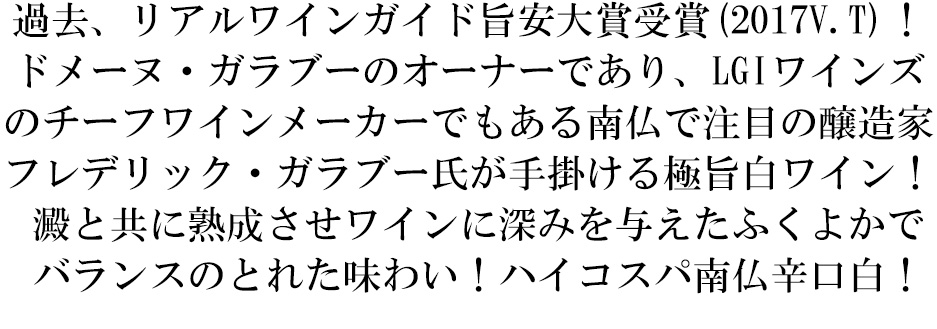 「レ ペイロタン」は、ドメーヌ ガラブーのオーナーであり、LGIワインズのチーフワインメーカーであるフレデリック ガラブーが手掛けるワインです。現代的な醸造技術を活用しつつ、伝統的なフランスワインの良さを表現したワインを目指しています。ぞれぞれの品種が持つ香りや味わいの個性が生かされています。 ルヴュ デュ ヴァン ド フランスでも高評価 南仏リムーで今最も注目の人物…「ドニ ドゥブルデュー教授の教えを受ける」 フレデリック ガラブー(Frederic Garrabou)は、世界中の様々な場所でワイン造りを学び、数多くの経験を積んでいます。ワイン造りを学ぶため、ラングドックを離れ、ブルゴーニュのボーヌのBTS Viti-oenoで学び、またアンヌ フランソワーズ グロ、ドメーヌ シャンソンといった著名ドメーヌでワイン造りを経験しています。ブルゴーニュでは、テロワールを尊重し、単一品種で仕込むワイン造りについて知識を深めました。その後、さらに2年間、ボルドーのISVVで学び、偉大なワインメーカーであったドニ ドゥブルデュー教授の教えを受けました。さらに世界のワイン造りを知るために、カリフォルニア、オーストラリア、ニュージーランドなどニューワールドで修業を積みました。国が変われば、品種やワイン造りの方法も違います。そこで彼は醸造学というものを深く理解することになりました。 「実家のあるリムーでドメーヌを設立」 そして2014年、フレデリックは故郷に戻り、リムーのガルディ(Gardie)に所有する実家のドメーヌでワイン造りをスタートさせました。畑の面積は22ha、ピレネー山脈の麓に広がっています。フレデリックが実家に戻る以前の祖父や父の時代には、育てた葡萄はすべて農協へ売っていました。しかし、彼は自分のドメーヌ名のワインを造りたい思い、栽培方法を以前と変えるなど自分が培ってきた経験と知識を生かし、ついに最初のワイン2016年ヴィンテージをリリースするに至りました。 ※BTS Viti-oeno:Brevet de Technicien Superieur Agricole en Viticulture ?nologie 葡萄栽培学における高等農業技術者の修了証 「フレデリック ガラブーは情熱を持った慎重な若きエノログである。ボルドーやブルゴーニュ、さらにニューワールドなど他の土地で学んだワイン造りの経験をガルディに所有する家族の畑で、生かしたいという情熱を持っている。畑のある場所は、リムーのアペラシオンの中でもたいへん地中海に近い場所にある。また、慎重な彼がファーストヴィンテージのために使ったのは、22ヘクタールあるうちのわずか1ヘクタールのみであった。ファーストヴィンテージである2016年は2種類のワインを造ったが、すでに非常に興味深いもので、その技量は確かなものである。2017年も非常にフレッシュで調和が取れたワインになっている。とりわけピノ ノワールはゴージャスだが、雹のために極めて生産量が少なくなる見込みだ(600本のみ)。 「ラ ルヴュ ド ヴァン ド フランス2019.2」 <以下、フレデリックのコメント> 「他人のためにワインを造ることと、自分自身のための葡萄からワイン造ることは大きく違います。自分のワインには自分自身が深く関わり、大きく反映されるのです。すべてが自分の意志で決断しなければなりませんから、これまで経験してこなかったリスクを背負うことになりました。皆様が私のワインを喜んでくださればよいと思います。そして私がワイン造りの中で感じた喜びやパッションを飲む人に感じていただきたいです。」 | ![]() ■ぶどう品種:シャルドネ種100% ■発酵・熟成:アルコール発酵は15度の低温にコントロールしながらステンレスタンクで行います/ 熟成はステンレスタンクで、綺麗な澱とともに5ヶ月/ 熟成中はソフトな味わいを出し、アロマを深めるためにバトナージュを行います 南フランス辛口白ワイン愛好家大注目!今、ブルゴーニュ・シャルドネの価格高騰により南フランスのシャルドネも大注目されています!ラングドック&ルーション地方のシャルドネ種100%辛口ファン大注目! 澱と共に熟成させワインに深みを与えたふくよかでバランスのとれた味わいの辛口白ワイン!南仏らしい豊かな果実味がとバランスのとれたシャルドネ100%の親しみやすい1本! 「レ・ペイロタン」は、ドメーヌ・ガラブーのオーナーであり、LGIワインズのチーフワインメーカーでもある南仏で注目の醸造家フレデリック・ガラブーが手掛けるワインで品質と価格を両立させたこのシリーズは、現代的な醸造技術を活用しつつ、伝統的なフランスワインの良さを表現したワインを目指しています! それぞれの品種が持つ香りや味わいの個性が生かされています!口に含むとジューシーでとてもバランスが良く、余韻はとてもフレッシュです!まさにハイコスパ南仏辛口シャルドネ100%白ワインが国際コンクール金賞受賞酒で限定で少量入荷! |