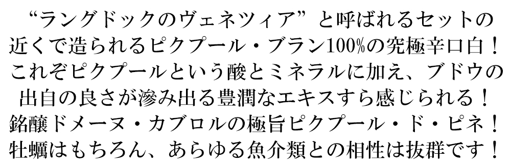 ラングドックでブドウ品種をAOC名に冠する唯一のアペラシオン、ピクプー ル・ド・ピネ。コトー・デュ・ラングドックのクリュのひとつで、地中海に面した同 国屈指の大きさを誇る湖、トー湖周辺の6つのコミューンから成る。この地方 最古の土着品種ピクプール・ブランから白のみが造られており、オクシタン語 で「ピクプール=唇を刺すもの」を意味する通り、高い酸を持つ品種の特徴 が、石灰豊富な土壌、北風と潮風の影響から内陸部よりも涼しい気候と相 まって、引き締まった酸、堅牢なミネラル、華やかな香りを身上とする。17世紀 には既に評判を得ていたこのピクプールというブドウのポテンシャルと、それ を育むべく存在するかのようなテロワールを余すことなく表現するため、惜し みない情熱を注いでいるのがドメーヌ・カブロルである。