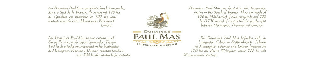 「高品質」かつ「ヴァリュー・ワイン」である事。一見矛盾するその哲学が成し遂げられる秘密は、ドメーヌが掲げるポリシー、「Luxe Rural」にあります:受継いできた伝統を尊重しながら、新しい手法や考え方を取り入れて高めていくことで、借り物ではない、本物の味わい造ること。またその努力が価値ある素晴らしいワインを造ることになる。フランスとイギリスのビジネススクールで学んだジャン・クロード・マス氏は、フランスの伝統とニューワールドの革新的な手法や商業的な考え方を融合させ、その考えをワインで表現しています。 | ぶどう品種:カベルネ・ソーヴィニヨン100%