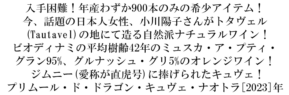 【商品名】プリムール ド ドラゴン キュヴェ ナオトラ 2023 マス デュ ドラゴン ド ピエール元詰 年産僅か900本のみ オレンジワイン 自然派 【英名】Primeur de Dragon Cuve Naotora 2023 Mas Du Dragon De Pierres Vin de France 【商品説明】入手困難!自然派オレンジワイン愛好家大注目!年産わずか900本のみの希少アイテム!南フランスのルーション地方ペルピニャン西北の町、トタヴェル(Tautavel)の地にて日本人女性、小川陽子さんが造る自然派ナチュラルワイン!マス・デュ・ドラゴン・ド・ピエールについて輸入元様のコメントは「南仏ルーションのペルピニャン(Perpignan)西北の町、トタヴェル(Tautavel)という地に日本人女性、小川陽子(Yoko Ogawa)さんがナチュラルワインを造り始めました。彼女は1970年8月18日、群馬県で生まれ千葉の小学校に4年生まで通い、その後ずっと神奈川県の湘南で暮らしておりました。東京の大学を卒業後、コンサルタント会社に勤め、その後もう一度大学院で勉強したいとアメリカに渡ります。そこでマスターを取得、その後、国連の仕事に従事します。2013年フランス語を勉強する為、パリのソルボンヌで語学の勉強、そして2014年ブルゴーニュDijonでワインの勉強をします。その頃から本当にやりたい事は何だろう?と考え、エコツーリズム(地域ぐるみで自然環境や歴史文化など、地域固有の魅力を観光客に伝えることにより、その価値や大切さが理解され、保全につながっていくことを目指していく仕組み)をしたい!と思うようになりました。フランス人のパートナーと一緒にフランス中の物件を探して、たどり着いた地はこのTautavelでした。19haの敷地には7haの葡萄畑があり「ワインを造るしかない」と決心。彼女の面白いのはワインが造りたくて畑を買ったのではなく、エコツーリズムを始める一貫で畑があったのですが、今ではそのワイン造りが面白くなり本格的になったというご縁な事です。そして葡萄を育てワインを造っているうちに、ごくごく自然にナチュラルワインの世界に入ってしまったのです。有り難い事に前の畑の所有者はBio実践者のDomaine Victor、彼らは14ha所有しておりましたが、陽子さんに7ha売り、今は彼らも7haです。念願の自分達だけの醸造所が2021年に出来上がり、収穫中の忙しい時に水と電気が使えるようになったというバタバタ劇です。でもそのおかげで、素晴らしい醸造所です。彼女の感性がぎっしりと詰まったお城です。電気会社と契約しないで太陽光だけ、常に自然との調和を大事にし、ゴミだって敷地内で全て処理します。ずっと一人で畑仕事をしておりましたが、醸造所の建設に並行し、2021年春の剪定からニコラさんがいつも手伝ってくれています。農法は2020年からビオディナミに切り替えました。畑は1.5haはフランス人が大きなトラクターで、1haは生産者仲間のLe Clos de la Soifのフローラが馬で、4.5haは陽子さんが小さなトラクターで耕していましたが、2020年からは基本的に耕すのを止めました。土の中の構成を生かすために、土壌を分析して足りない物を逆に足すという農法に変えたのです。散布に関してはトラクターを使わず、全て手で行います。彼女の正式初リリースのワインを是非召し上がって下さい。本数は少ないのでお早めに!」このプリムール・ド・ドラゴン・キュヴェ・ナオトラ[2023]年は、AOCコート・デュ・ルーション、IGTコート・カタランからのフェルマージュ畑100%のビオディナミ農法の平均樹齢42年のミュスカ・ア・プティ・グラン95%(muscat a petits grains)、グルナッシュ・グリ5%(grenache gris)を手摘み収穫100%&手動選別!除梗後、足踏み破砕し、10 日間の浸漬マセラシオン!自生酵母のみによる発酵!澱引き4回!ステンレスタンクと古樽で5ヵ月熟成!無清澄&無濾過で瓶詰め!このワインについて小川陽子さんは「葡萄の果皮を漬けて醸すことで、眼にも嬉しいオレンジ色のワインが出来ました。ミュスカ品種由来のフローラルな香りと共に魅力的なキュヴェ。程よいタンニンとまろやかな味わいで、合わせられる食事の幅も広く、そのまま飲んでもOK。当ドメーヌの女性の造り手の愛車「直虎号」に捧げられたキュヴェ。※ドメーヌの当主に毎日のように付き添ってくれるスズキジムニー(愛称が直虎号)に捧げられたキュヴェ。小ぶりな車体で畑のどんな急斜面でも登ってくれるなくてはならない、頼もしい相棒です。」戦国時代、後に徳川四天王の一人に数えられ彦根藩の藩主となり井伊直弼を育てた遠州井伊谷の女藩主・井伊直虎にちなんで名付けました!今、話題の日本人女性、小川陽子さんが造る自然派ナチュラルオレンジワイン!プリムール・ド・ドラゴン・キュヴェ・ナオトラ[2023]年が遂に数量限定で極少量入荷! 【タイプ】白(オレンジ)・辛口 【生産年】2023 【生産者】マス・デュ・ドラゴン・ド・ピエール元詰 【生産地】フランス/ルーション/ヴァン・ド・フランス 【品種/セパージュ アッサンブラージュ】ミュスカ・ア・プティ・グラン95%、グルナッシュ・グリ5% 【内容量】750m