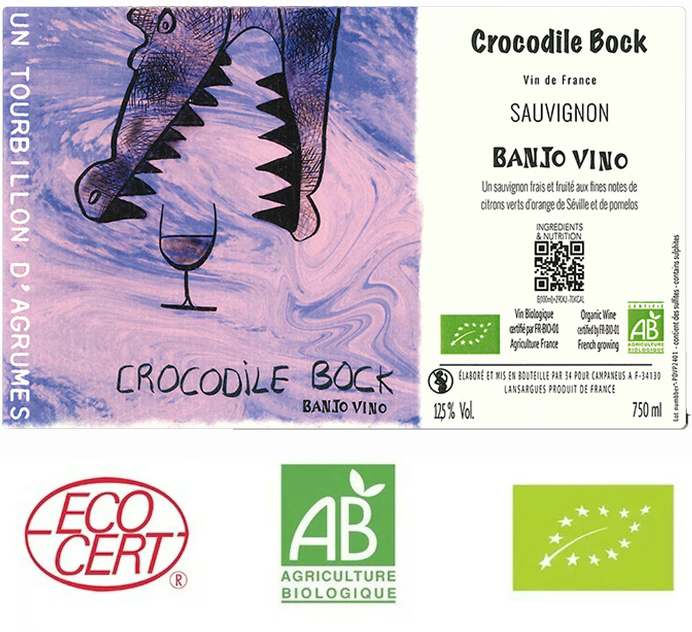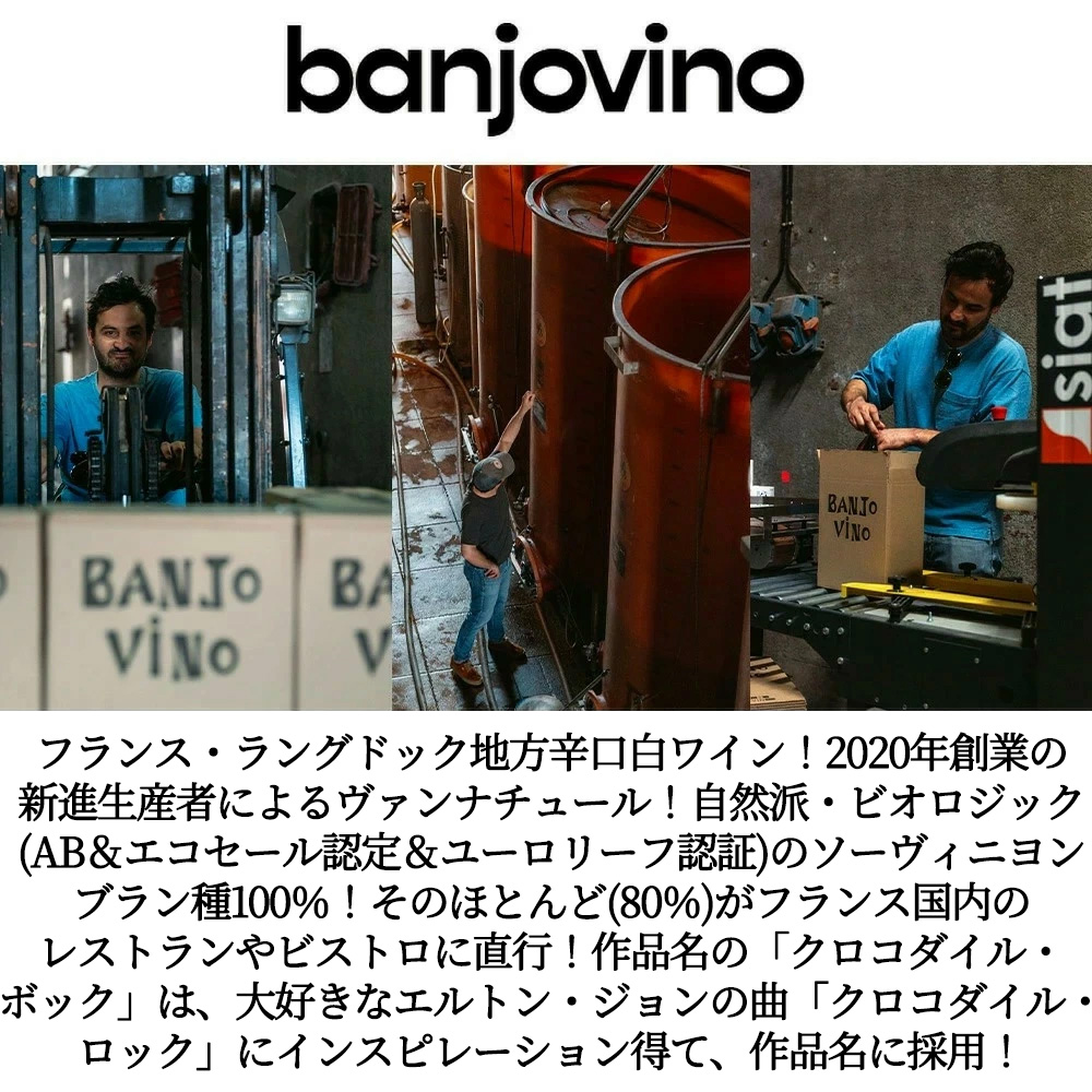 【商品名】クロコディール・ボック・NV・バンジョー・ヴィーノ(アレクシス・リヴェ・ド・サバティエ家)・(2020年創業の新進生産者)自然派・ビオロジック(AB&エコセール認定&ユーロリーフ認証)・ソーヴィニヨン・ブラン種100%・VDF・(ヴァン・ナチュール)・13%・(この作品は大好きなエルトン・ジョンの曲「クロコダイル・ロック」にインスピレーションを得たもの)【英名】Crocodile Bock NV Banjo Vino VDF OrganicWine (BiologiqueWine) (AB&ECOCERT) Sauvignon Blanc 100%