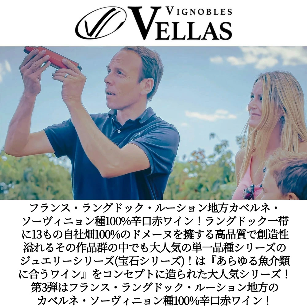 【商品説明】フランス・ラングドック・ルーション地方辛口フルボディ赤ワイン愛好家大注目!ラングドック・ルーション地方カベルネ・ソーヴィニヨン種100%辛口赤ワイン!4代目ニコラ・ベラスの燃えるような情熱と確かな腕、類まれなセンスによって飛躍的な発展を遂げ、ラングドック一帯に13もの自社畑100%のドメーヌを擁する高品質で創造性溢れるその作品群は、フランス全土はもちろん、世界50ヵ国以上で親しまれています!その中でも大人気の単一品種シリーズのジュエリーシリーズ(宝石シリーズ)!は『あらゆる魚介類に合うワイン』をコンセプトに造られた大人気シリーズ! 造り手は「Guide Hachette」、「La Revue du Vin de France」等ワインプレスも大注目!モンペリエ市のすぐ北、ラングドック中心部のテラン村(Teyran)に1929年より続くぶどう栽培家で長らく協同組合に加盟していましたが、1995年に4代目ニコラ・ベラスが脱退してドメーヌを興しました!当時は13ヘクタールの畑を所有していましたが、ニコラの燃えるような情熱と確かな腕、類まれなセンスによって飛躍的な発展を遂げ、2024年現在の総所有面積340ヘクタール、ラングドック一帯に13もの自社畑100%のドメーヌを擁する一大グループへと成長しました!高品質で創造性溢れるその作品群は、フランス全土はもちろん、世界50ヵ国以上で親しまれています!4代目ニコラ・ベラスいわく「卓越性、信頼性、革新性を追究し続けることが私のモットーです。飲んでくださる方の本当の感情を解放するワインを造りたいと思っています」! このブラック・ダイヤモンド(カベルネ・ソーヴィニヨン)[2023]年(宝石シリーズ)・ヴィニョーブル・ヴェラス元詰(4代目ニコラ・ベラス家)はブラック・ダイヤモンドをイメージしたカベルネ・ソーヴィニョン種100%の辛口赤ワイン!IGP Pays d'Oc。カベルネ・ソーヴィニヨン種100%。粘土石灰質土壌。平均樹齢35年のVV。収量は50hl/ha。ステンレスタンクで発酵後、225リットルの樽で12ヶ月間熟成。(自社醸造100%&自社瓶詰め100%)で造られます。 メタリック調のブラックダイヤモンドの一段と目を引く高級エチケットはレストラン様やカフェバー様でも大人気です!もちろん誕生石の方へのプレゼントにも最適です。もちろん現地のセラー数ヶ月前のセラー出し品の素晴らしい状態で限定入荷!