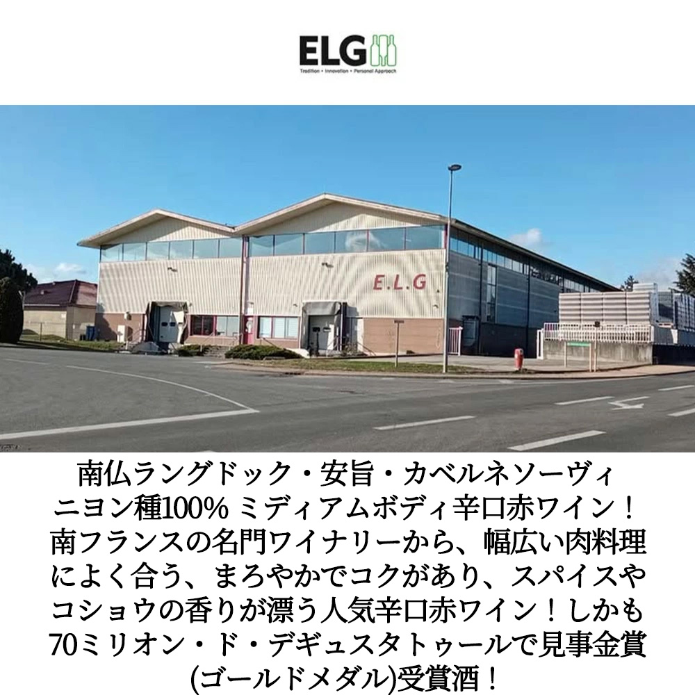 【商品説明】南フランス・ラングドック・ルーション地方からカベルネ・ソーヴィニョン種100%辛口赤ワイン!フランス・安旨地ラングドック金賞ワイン!フランス・ラングドック・ルーション辛口赤ワイン愛好家大注目!南仏ラングドック・安旨・カベルネソーヴィニヨン種100%ミディアムボディ辛口赤ワイン!しかも70ミリオン・ド・デギュスタトゥール金賞(ゴールドメダル)受賞酒! 太陽の降り注ぐ人気の広大なワイン産地(カマルグからコート=ヴェルメイユに及ぶ地中海と山々に挟まれたフランス最大のぶどう畑の中心地)I.G.P.ペイドックで生産されるカベルネ・ソーヴィニヨン種100%のミディアムボディ辛口赤ワイン! 造り手はラングドック・ルーションの高品質で魅力的な価格帯のワインを世界20カ国以上に送り出しているネゴシアンE.L.G.社(南フランスの名門ワイナリーELG社=「ラングドック地方のテロワールを十分に活かす」という確固たる信念のもと、日々変化していくニーズに耳を傾ける。近代的製法を取り入れながら高品質で果実味あふれるラングドックの魅力を発信すべく邁進する造り手。) 5世代に渡るワイン造り歴史があり、ブルゴーニュ、ボジョレー、ローヌ、ルーション地方など、複数のエリアに畑を所有している南フランスの名門ワイナリーです。ブルゴーニュとボジョレーに20haの畑と、ルーション地方のコスティエール・ド・ニームに55haの畑を所有しています。 ダークルビーレッド色のこのワインはまろやかでコクがあり、スパイスやコショウの香りが漂います!幅広い肉料理によく合います!提供温度16-18度