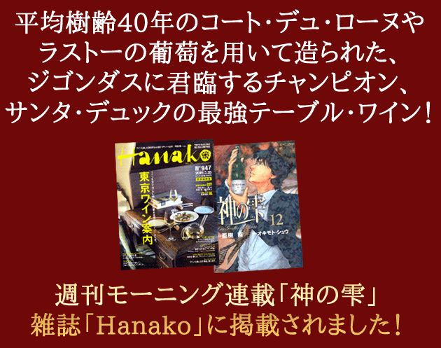 ![]() ヴァンサン・ジラルダンがブルゴーニュのライジングスターなら、イヴ・グラはまちがいなくコート・デュ・ローヌ南部のライジングスターといってもよいでしょう。小柄だが筋骨たくましく陽気なイヴ グラによって営まれているドメーヌで、1985年に父親のエドモン・グラから引き継ぎました。それまでは大半がバルクでネゴシアンに売られていましたが、イヴ・グラの代になってすべて自家葡萄園元詰めに切り替えました。葡萄園面積は約10haで、コート・デュ・ローヌ南部のドメーヌとしてはさほど大きくありません。しかしこの小さなドメーヌで、イヴ・グラによって造られるワインは、今や世界中のワイン評論家を驚かせています。 ![]() ロバート・パーカー氏は、ジゴンダスの五ツ星生産者として、非常に高く評価しており、『ローヌ・ヴァレー』の中で、「私にいわせればサンタ・デュックはジゴンダスに君臨するチャンピオンである」と述べ、また「ワインスペクテーター」誌が選んだ2000年のBest100の中で、彼の1998年ジゴンダスが15位にランキングされました。いかなるワイン雑誌でも、ジゴンダスについて語られ、ドメーヌ・サンタ・デュックの名前が出てこないということは、決してありません。ロバート・パーカー「ワールド・グレイテスト・ワイン・エステート」に掲載されました。サンタ・デュックのワインは、フランスの著名なレストラン、アラン・シャペル、ミシェル・ブラス、ウストー・ド・ボーマニエール、ラ・ピラミッド、ローベルガード、クリスチャン・エティエンヌ等でも使われています。ミシュラン一ッ星のオーナーと協同経営で、120種類のワインを置く「bistro du'O」(ビストロ・デュ・オー)という店をオープンしました。 ![]() ここ10年間のうちに頭角を現してきたドメーヌ・サンタ・デュックは、今ではジゴンタスでナンバーワンのエステートとして広く知られています。背が高く、ルックスの良いイヴ・グラは、おそらく30代半ばですが、より若くさえ見えます。彼は、父親であるエドモン・グラが1985年に引退したとき、引継ぎました。それまで実質的に生産したワインは、そっくりそのまま様々なネゴシアンに売られていました。イヴは、若い活動力と情熱にあふれ、新しい考えで、エステートを今までとはことなる方向へ持っていき、ここの葡萄畑でとれたワインのほとんどを自家葡萄園元詰にする決意をしました。ロバート・パーカー「ローヌ・ヴァレー」より |