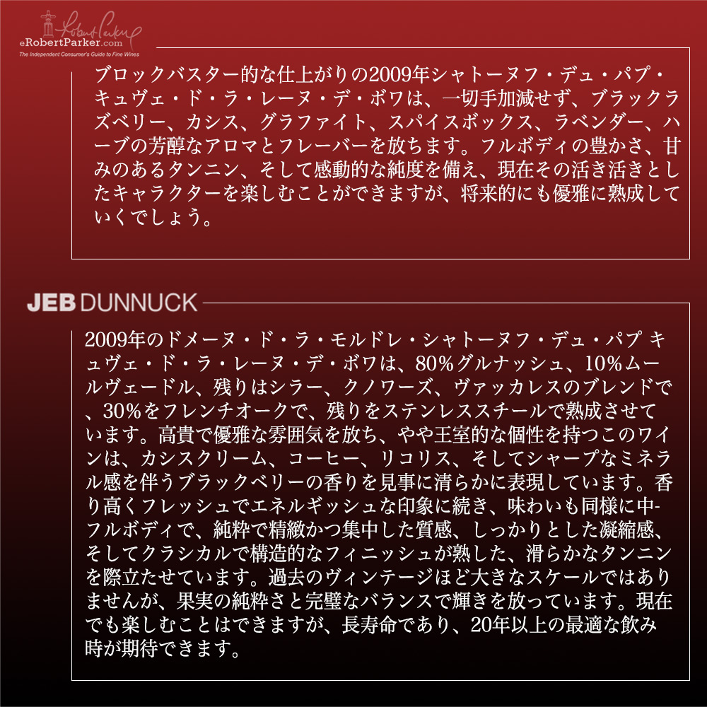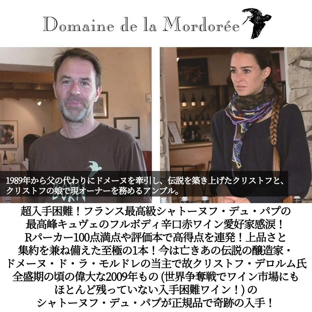 【商品説明】超入手困難!フランス最高級ローヌ辛口フルボディ赤ワイン愛好家垂涎!シャトーヌフ・デュ・パプの最高峰キュヴェのフルボディ辛口赤ワイン愛好家感涙!多くの専門誌や評価本で高得点を連発!上品さと集約を兼ね備えた至極の1本! 今は亡きあの伝説の醸造家・ドメーヌ・ド・ラ・モルドレの当主で故クリストフ・デロルム氏全盛期の頃の2009年もののシャトーヌフ・デュ・パプが正規品で奇跡の入手! しかも世界争奪戦でワイン市場にもほとんど残っていない入手困難ヴィンテージ! 貴重なドメーヌ・ド・ラ・モルドレの希少な16年熟成作品のグレイトヴィンテージ2009年のシャトーヌフ・デュ・パプ赤!しかも世界中のワイン愛好家から渇望される、幻のキュヴェ・フルボディ赤ワイン! あのロバート・パーカー氏が自身の個人セラーにも買い求めたと言われる、幻の超限定ワイン! もちろんロバート・パーカー満点5つ星★★★★★生産者で、この2009年でパーカーポイント驚異の96点獲得!絶賛コメントは『ブロックバスター的な仕上がりの2009年シャトーヌフ・デュ・パプ・キュヴェ・ド・ラ・レーヌ・デ・ボワは、一切手加減せず、ブラックラズベリー、カシス、グラファイト、スパイスボックス、ラベンダー、ハーブの芳醇なアロマとフレーバーを放ちます。フルボディの豊かさ、甘みのあるタンニン、そして感動的な純度を備え、現在その活き活きとしたキャラクターを楽しむことができますが、将来的にも優雅に熟成していくでしょう。96点』と大絶賛! ジェブダナック驚異95点獲得!絶賛コメントは『2009年のドメーヌ・ド・ラ・モルドレ・シャトーヌフ・デュ・パプ キュヴェ・ド・ラ・レーヌ・デ・ボワは、80%グルナッシュ、10%ムールヴェードル、残りはシラー、クノワーズ、ヴァッカレスのブレンドで、30%をフレンチオークで、残りをステンレススチールで熟成させています。高貴で優雅な雰囲気を放ち、やや王室的な個性を持つこのワインは、カシスクリーム、コーヒー、リコリス、そしてシャープなミネラル感を伴うブラックベリーの香りを見事に清らかに表現しています。香り高くフレッシュでエネルギッシュな印象に続き、味わいも同様に中-フルボディで、純粋で精緻かつ集中した質感、しっかりとした凝縮感、そしてクラシカルで構造的なフィニッシュが熟した、滑らかなタンニンを際立たせています。過去のヴィンテージほど大きなスケールではありませんが、果実の純粋さと完璧なバランスで輝きを放っています。現在でも楽しむことはできますが、長寿命であり、20年以上の最適な飲み時が期待できます。95点』とこれまた大注目! 造り手は、ロバート・パーカー5つ星生産者で、世界のワイン愛好家から渇望されるシャトーヌフの大人気生産者ドメーヌ・ド・ラ・モルドレ!2015年6月に当主クリストフ・デロルム氏が、まだ52歳という若さで急死され、世界のワイン業界に悲報が入りました!その後、亡クリストフ氏にワイン造りを教えた人物、彼の父親のフランシス・デロルム氏がワイン造りを引き継ぎ、この素晴らしいヴィンテージを完成!あの伝説の醸造家亡きクリストフ・デロルム氏も一番お気に入りだったワインがこのシャトーヌフ・デュ・パプだった!最高のシャトーヌフ・デュ・パプから生み出される卓越したキュヴェ!ラ・レイヌ・デ・ボワ!しかも南ローヌのグレイトヴィンテージで愛好家垂涎の2009年もの!しかも南ローヌの生産者が口を揃えて偉大なグレイトヴィンテージ!と絶賛する大人気ヴィンテージ[2009]年! エレガンスと集約を兼ね備え、余韻の長さが他のワインとは比べ物にならない、パーフェクトとも言えるシャトーヌフ・デュ・パプです!しかもシャトーヌフにおける最上区画「ラ・クロー」畑からの究極赤ワイン!シリカと小石の混ざった粘土質土壌!収穫量を平均樹齢60年以上のスーパーV.V (ヴィエイユ・ヴィーニュ) から、ロマネ・コンティも真っ青の驚異の低収量!自然派・ビオロジック (AB認定&ユーロリーフ認証) のオーガニック葡萄、グルナッシュ種、ムール・ヴェードル種、シラー種、クノワーズ種、ヴァカレーゼ種!を30日という長い時間をかけゆっくりと発酵!透けて通らない濃いルビー色!溶かした甘草、アカシアの花、ラベンダー、ブルーベリー、チェリーブランデーに、黒トリュフやコーヒー、濃縮した赤い果実のアロマ!ワイン愛好家垂涎!南ローヌ愛好家垂涎!全世界完全割り当ての入手困難モルドレ最高峰赤ワイン“キュヴェ・ド・ラ・レイヌ・デ・ボワ”の偉大な大人気グレイトヴィンテージ[2009]年が蔵出し作品で正規品で奇跡の限定で極少量入荷!