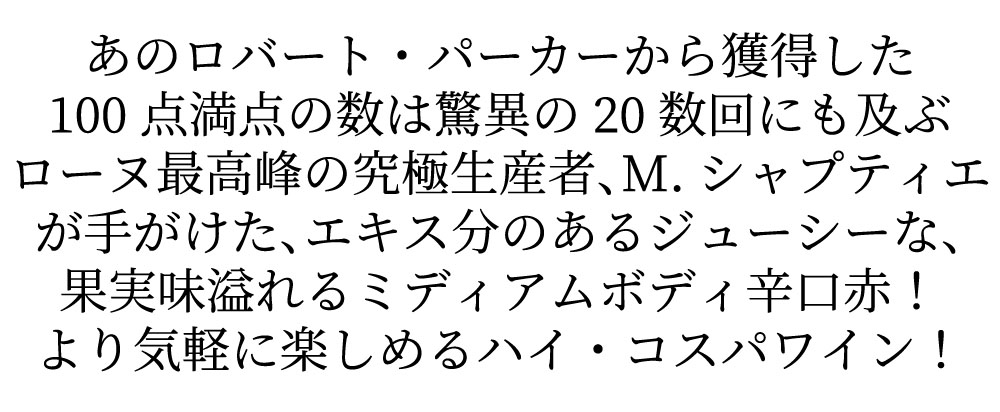 ![]() M・シャプティエ・ペイ・ドック・ルージュ[2023]年・M・シャプティエ社・I.G.P・ペイ・ドック・ルージュ ■ 品種:グルナッシュ54%、シラー種46% ■ 平均樹齢:30~40年 造り手は、1808年創業!R.パーカー100点満点生産者であり、タン・エルミタージュを拠点とする、ローヌ地方を代表する銘醸生産者であり、世界のトップクラスのワイン生産者として知られるM.シャプティ社!あのロバート・パーカーから獲得した100点満点の数は驚異の20数回にも及ぶローヌ最高峰の究極生産者、M.シャプティエが手がけた、より気軽に楽しめるハイ・コスパワイン! 銘醸ワインの生産者として名高いM.シャプティエ社が手がけた、より気軽に楽しめるワインです。赤い果実を思わせる香りと果実味にあふれたフレッシュな味わい。 【テイスティングコメント】 赤い果実を思わせる香りと果実味にあふれたフレッシュな味わい!赤いベリー類やカシスを連想させる瑞々しい香り!エキス分のあるジューシーな果実味溢れます! |