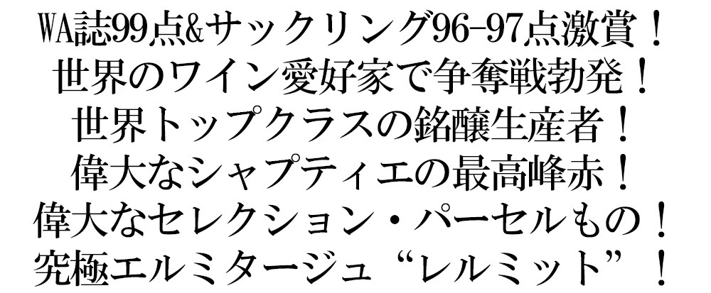 ![]() エルミタージュ レルミット 2016年 M.シャプティエ ■ ぶどう品種:シラー種100% ■ 平均樹齢:80年 エルミタージュの丘の頂上付近のシャペルの周囲に広がる日当たりの良い斜面、区画毎ごとに細分化された単一畑でビオディナミ農法で栽培される樹齢驚異の80年以上の古樹シラー100%を手摘み100%で造られます。 醸造家自ら最低でも35~60年、うまく行けば50年~75年キープできると絶賛する、ずばり最高峰ワインと言う名にふさわしい逸品中の逸品!テロワール自身に語らせ、テロワールの写真を撮るようにワイン造りを行う。そしてM.シャプティエの哲学ともいえる Fac & Spera 「人事を尽くして天命を待つ」を貫いた究極フルボディ辛口赤ワイン! ![]() |