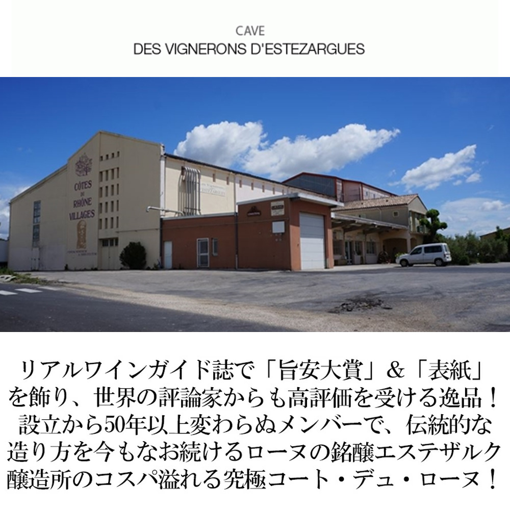 【商品説明】フランス・ローヌ辛口赤ワイン愛好家大注目!エステザルクファン注目!ローヌでは珍しいハーフサイズ!リアルワインガイド誌で「旨安大賞」&「表紙」を飾り、評論家からも高評価ワイン!さらに「アシェット・ガイド誌」「クラスマン誌」「RVF誌」も優良生産者として大注目!「デカンター」誌も「良心的な価格のローヌ」として過去に掲載!設立から50年以上変わらぬメンバー(メンバーは、各自の畑は自分で管理し、最も良い葡萄約1/3をドメーヌ名で出荷、1/3は組合名で瓶詰めし、残りはネゴシアンに売却!)1965年創業の生産組合、エステザルク醸造所!全葡萄は個々に管理しますが、設備は共有し、負担を分担!選別酵母やろ過、清澄などのワインを損ねる総ての技術は使用せず、果実味と土壌の可能性を生かすように醸造!伝統的な造り方を今もなお続けるエステザルク醸造所の特徴は全てのコート・デュ・ローヌの赤ワインにシラーをブレンドしていること!このコート・デュ・ローヌ・ルージュ・ル・プティ・アンデゾンにいたっては自然派テッラ・ヴィティスのシラー種('16VTからシラーは、ドメーヌ ダンデゾンの葡萄のみを使用)を全体の2/3、残りグルナッシュ種1/3を使用!マロラクティック発酵の後、澱引きを行い、ステンレスタンクで約6ヶ月熟成!ノンフィルターで瓶詰めされる驚く程しっかりとした果実味があり、非常にバランスがとれた味わい!コストパフォーマンス溢れる究極コート・デュ・ローヌがハーフサイズで待望の少量入荷!