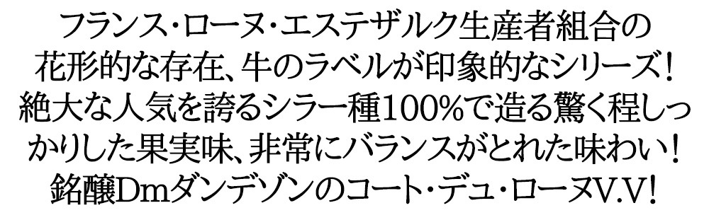 【商品説明】フランス・ローヌ・フルボディ辛口赤ワイン愛好家大注目!エステザルク&ダンデゾンファン大注目!牛のラベルが印象的、シリーズで絶大な人気を誇るシラー種100%!エステザルク生産者組合の花形的な存在!ドメーヌ・ダンデゾンのヴィエイユ・ヴィーニュ!リアルワインガイド誌で「旨安大賞」&「表紙」を飾り、評論家からも高評価!さらに「アシェット・ガイド誌」「クラスマン誌」「RVF誌」も優良生産者として大注目!「デカンター」誌も「良心的な価格のローヌ」として過去に掲載!設立から50年以上変わらぬメンバー(メンバーは、各自の畑は自分で管理し、最も良い葡萄約1/3をドメーヌ名で出荷、1/3は組合名で瓶詰めし、残りはネゴシアンに売却!)1965年創業の生産組合、エステザルク醸造所!全葡萄は個々に管理しますが、設備は共有し、負担を分担!選別酵母やろ過、清澄などのワインを損ねる総ての技術は使用せず、果実味と土壌の可能性を生かすように醸造!伝統的な造り方を今もなお続けるエステザルク醸造所の特徴は全てのコート・デュ・ローヌの赤ワインにシラーをブレンドしていること!(このワインは100%シラー種)マロラクティック発酵の後、澱引きを行い、ステンレスタンクで約6ヶ月熟成!ノンフィルターで瓶詰めされる驚く程しっかりとした果実味があり、非常にバランスがとれた味わい!土壌は、同じダンデゾンのシニャルグより粘土質が多くなっています!このキュヴェは、南のエステザルク村と少し北に位置するヴァリギエール村の二つの村の葡萄を使用しています!割合はヴィンテージによって違い、とても興味深いものとなります!6ヶ月ステンレスタンクで熟成させます!ほとんど透けて通らない濃厚なカラーで、しっかりとした目の詰まった味わい、ダークフルーツやリコリス、ペッパーが感じられます!シラー種100%の攻撃的なタンニンのある割りには、しなやかさも兼ね備えています!コストパフォーマンス溢れる究極コート・デュ・ローヌが待望の牛ラベルで少量入荷!