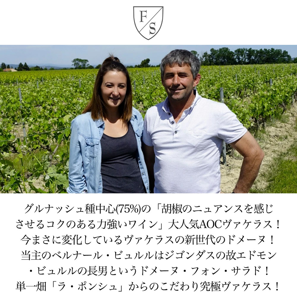 【商品説明】フランス・南ローヌ地方辛口フルボディ辛口赤ワイン愛好家大注目!グルナッシュ種中心(75%)の「胡椒のニュアンスを感じさせるコクのある力強いワイン」として人気のAOCヴァケラス! しかも造り手は、今まさに変化している、ヴァケラスの新世代のドメーヌ!「甘みがあって、リッチなスタイルをしかもお値打ちな価格で」がポリシーのベルナール・ビュルル!その娘のクレールがワイン造りに参加し、さらに洗練されたモダンなスタイルに南ローヌらしい力強さとエレガンスを持つこだわりのワイン! (2015年には、ベルナールの娘であるクレールがドメーヌに参加し、近年のワイン造りに大きな影響を与えています。クレールが参加してからのワインは、南ローヌらしい力強さを持ちながらも、洗練されたモダンなスタイルに仕上げており、エレガンスを感じさせます。クレールは1993年生まれで、モンペリエ醸造大学を卒業後、オーストラリアのワイナリーで研修しました。若いですが、非常にしっかりとしており、私たちが訪問した際には、おしゃべり好きな父とその兄弟たちが大騒ぎするのを一喝する場面もあるほどです。聡明で快活な彼女の働きが、フォン・サラドのワインをさらに磨きがかかったものにしており、今後も非常に楽しみな造り手と言えます。) 単一畑「ラ・ポンシュ」からの究極ヴァケラス!ドメーヌの裏にある標高の高い畑で、土壌は粘土質マール、周辺にはガリーグ(野生のハーブ)が自生しています!葡萄の平均樹齢は30年、収量は35hL/haです!収穫は手摘みです!発酵はコンクリートタンクで行い、醸しの期間は18~25日間!毎日ルモンタージュします!コンクリートタンクで 10~12ヶ月熟成させます!ろ過せず瓶詰めします!熟した赤いフルーツのアロマがあり、果実味は非常にピュアで、しっかりとした骨格とタンニンが感じられる究極ヴァケラスが正規品で限定で少量入荷!