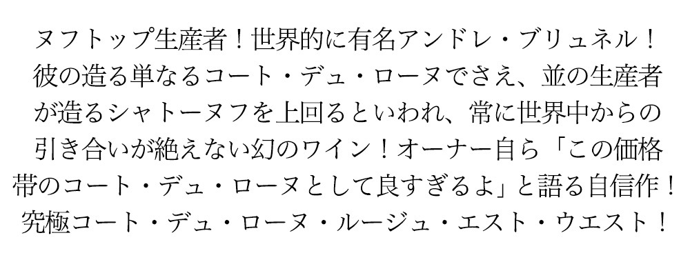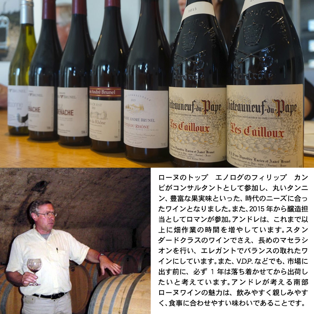 生産者であるアンドレ ブルネルは、シャトーヌフ デュ パプの最もエネルギッシュで、力量のある生産者の一人です。父親の仕事であるワイン造りに参加するようになると、めきめきとトップクラスの生産者としての頭角を現しました。今や世界的に有名になってしまったアンドレ・ブルネルのワインは、私どもも何とか僅かでも量を増やしていただこうと、毎年の買い付けには必ず訪問するほどです。