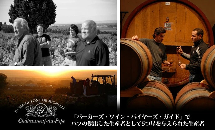 ![]() ドメーヌは19世紀より存在していましたが、1950年、先代のエティエンヌ・ゴネ氏によってシャトーヌフ・デュ・パプに設立。1974年からは、息子のジャンとミッシェルの兄弟がドメーヌを運営し、化学肥料や農薬を一切使わない有機農法で、ワイン造りを行う。 ![]() 十数年来、彼らの顧客から「こんなに素晴らしいパプを造るのに、なぜローヌACを造らないんだ」と言われ続け、新たな土地を探していたと言う。そして2002年に、やっと念願のエステイトを購入。一昨年よりジャンとミッシェルの息子達である、ベルトランとギヨームが加わり、若さと果実味にあふれるコート・デュ・ローヌとコート・デュ・ローヌ・ヴィラージュのワインをリリースしています。 |