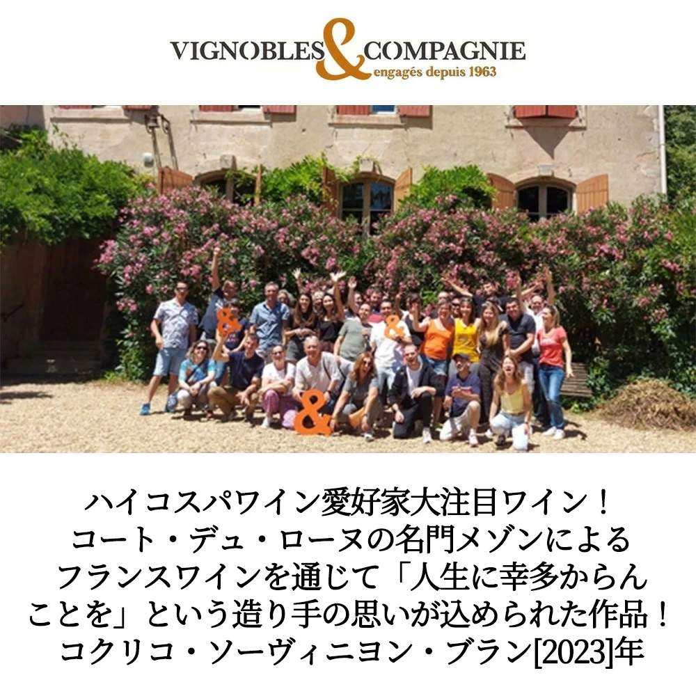 【商品説明】フランス・ローヌ辛口白ワイン愛好家大注目!ソーヴィニヨン・ブラン愛好家大注目!コート・デュ・ローヌ地方の名門メゾン「ヴィニョーブル&コンパニー」(2017年に「ラ・コンパニ・ローダニエンヌ」から社名変更)! 1963年、南仏アヴィニョン市郊外、世界遺産「ポン・デュ・ガール」のほど近くに設立された同社は、6年後の1969年、「シャトー・グリュオー・ラローズ」をはじめボルドーの21のシャトー等を所有する「タイヤン・グループ」の一員となり、以降同グループの中核メゾンとして、ローヌ、ラングドック、プロヴァンスといった南仏全般のワインを生産し、フランス国内はもちろん、世界40ヵ国に輸出しています!同社の品質管理はフランスワイン界最高レベルを誇り、国際的な衛生管理手法「HACCP」や品質マネージメント規格「ISO9001」、及び世界最大の食品検査機関「Eurofins」が統括する安全性・品質規格「IFS」の認証を取得しています!自社畑は所有しておらず、人的・技術的に深く関与する契約栽培農家から、ぶどうやマスト、ワインを購入して自社醸造を行っています! この「コクリコ(COQLICOT)」はCOQ(雄鶏)とCoquelicot(ポピーの花)をかけ合わせた文字遊び!フランスの象徴である雄鶏と、人生の希望や喜びといった思いが込められたポピーの花をかけ合わせています!フランスワインを通じて「人生に幸多からんことを」という造り手の思いが込められた作品! このコクリコ・ソーヴィニヨン・ブランは、厳選した樹齢20年以上のソーヴィニヨン・ブラン100%をコンクリートタンク発酵・コンクリートタンク熟成で造られるレモンやトロピカルフルーツの様な熟した果実味が楽しめる大人気辛口白ワイン!しかも開けやすいスクリューキャップでアウトドアでも大活躍!
