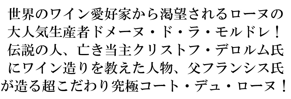 BORN・TO・MAKE・WINE/ 本物を造っているから成功した 「コート・デュ・ローヌ南部の スーパースター」 ドメーヌ・ド ラ・モルドレは、ローヌ河右岸のタヴェルで今最も注目されている生産者です。タヴェル、シャトーヌフ・デュ・パプ、リラック、コート・デュ・ローヌなどの見事なワインを産出しています。テロワールをリスペクトし、本物を造ることを心がけています。 「多くの生産者が賞賛」 クリストフは、僅か10年そこそこで一流生産者の仲間入りをしただけでなく、多くの生産者から尊敬されています。私共が訪問する多くの生産者は、彼を褒めたたえます。サンタ・デュックのイヴ・グラは、「これからモルドレに行く」と伝えると、「私もあなたたちといっしょに行って、彼のワインをすべて試飲したいよ。何度か彼のワインを飲んだけど本当にすばらしいね」と言っていました。感動的なワインを1ケースでも多く入手できるよう、毎年必ずドメーヌを訪問します。 「パワフルで集約感のあるスタイルから、よりエレガントな方向性に転換したい」と2014年に訪問した際クリストフルが話していたワイン造りの方向性は、彼の亡き後もしっかりと引き継がれています。 評価:ロバート・パーカー・Jr.「ワールド・グレイテスト・ワイン・エステイト」、ヒュー・ジョンソン「ポケット・ワイン・ブック2019」のリラックとタヴェルのトップ生産者として掲載。「ドロルム兄弟は、その若さにもかかわらず、20年近くにわたりガール県のリラックのアペラシオンでは揺るぎのないリーダーであり、ワインの品質を前代未聞のレベルまで引き上げた。近代的な醸造と熟成を頼りに、ワインは力強くすらりとし、洗練され、繊細で芳しい個性があり(特に見事な白では)、粗野なところがなく、はっきりとした性格を持っている。彼らはさらにシャトーヌフ・デュ・パプにおいても、上品なワインの輝きを探求し続けることができた。」ベタンヌ&ドゥソーヴ「フランスワイン格付け」 | ![]() ■ぶどう品種:シャルドネ60%/ ピノ・ノワール40% ■発酵・熟成:最低40ヶ月以上瓶熟/ 収穫後に丁寧にプレスし自然酵母での発酵/ 瓶内二次発酵後は澱と共に熟成(228リットルのオーク樽で醗酵&樽熟成)させノンフィルターで瓶詰め ■土壌:砂が混ざった粘土が豊富な土壌/ 地表から80cm下にはチョークの層がある 入手困難!爆発人気のR.Mシャンパーニュ・愛好家大注目!シャンパーニュ愛好家垂涎のシャルトーニュ・タイエのしかも単一畑100%のパーセルもの!しかも世界中の熱い注目を集める、かつてのグラン・クリュを現代に復活させた若手生産者であり、果てしない熱意を持った1983年生まれのアレクサンドル・シャルトーニュ! ジューシーかつ華やかな果実味、長い熟成期間が育む複雑さと細やかな泡!国内外の専門誌で得る高い注目度と評価!世界唯一のシャンパン専門評価誌において、スタンダート・キュヴェでさえ、NVシャンパーニュ部門で有名メゾンに並んでTOP10にランクイン! 山本昭彦氏の「1年に1度は飲みたい10本」にも選出!ミネラル豊かな味わいとなる。密度、エレガンス、軽やかさをも兼ね備えている大人気R.Mシャンパーニュの最高峰の人気キュヴェが単一畑100%のパーセルもので単一年産100%のエクストラブリュットで正規品で蔵出し品の素晴らしい状態で限定少量入荷! |