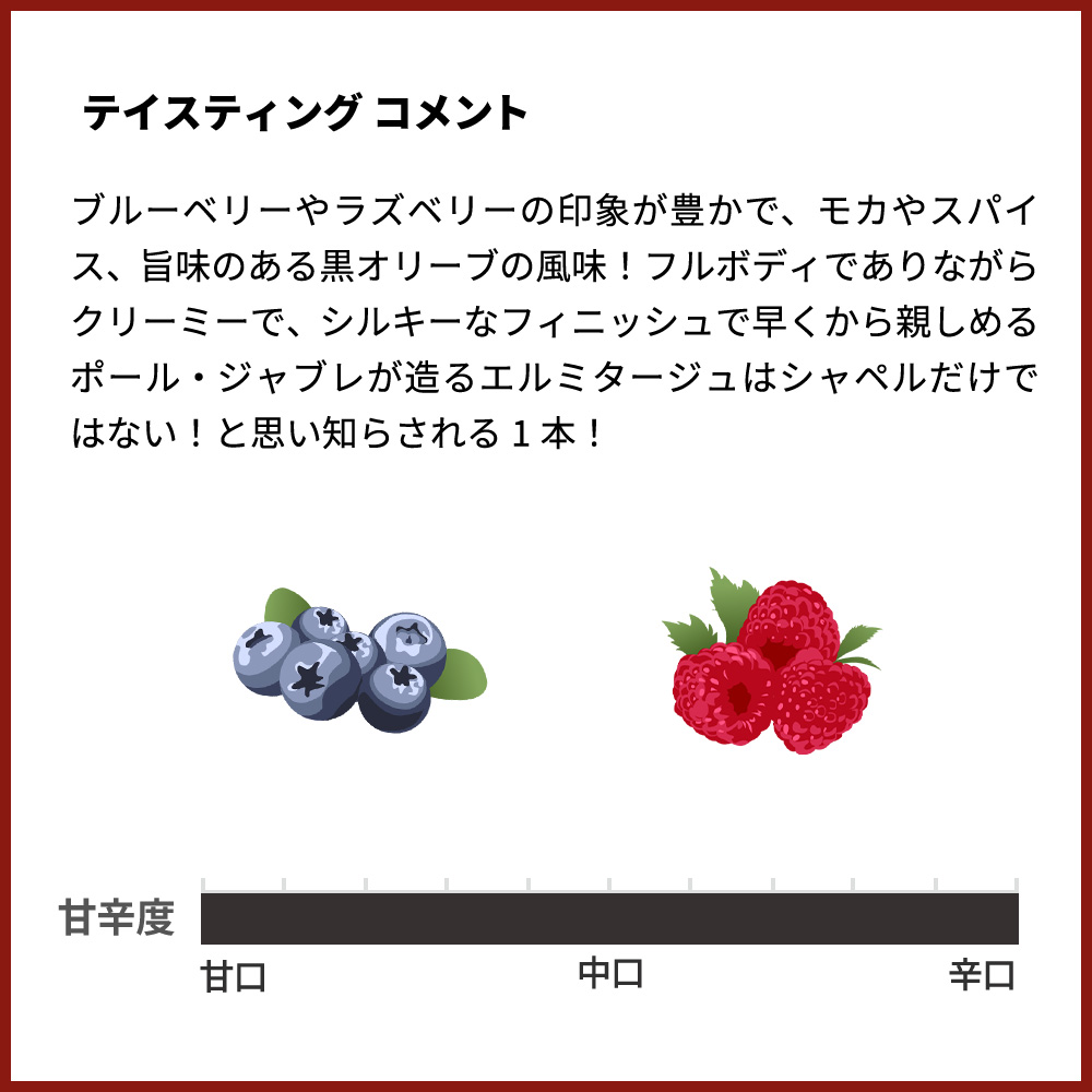 【商品説明】入手困難!フランス最高級ローヌ辛口フルボディ赤ワイン愛好家大注目!コレクター向け作品!高級シラー種100%最高級エルミタージュ愛好家大注目!シラー種100%で芳醇で長く香りが口に残ると言われる究極赤ワインで、ローヌ東岸の高級産地で赤白ともに20年以上の熟成をさせる価値があるとして定評の高級AOCエルミタージュ!ロバート・パーカー氏に「私にとって最も気分を高揚させる瞬間は、マルゴーやペトリュスではなく、熟成した最良のコート・ロティかエルミタージュのグラスを前にする時である」と絶賛させたエルミタージュAOC! しかも造り手は、エルミタージュ・ラ・シャペルでワイン愛好家を虜にするポール・シャブレ・エネ (現オーナーは、メドック格付のシャトー・ラ・ラギューヌと同じ) による最高評価の究極エルミタージュ!奇跡と呼ぶべきテロワール!丘の東側、ミュレ、クロワなどのエルミタージュ東部の区画のブドウを中心にブレンド!樹齢驚異の40~60年のシラー種100%を収量ロマネ・コンティも真っ青の驚異の10~18hl/ha!古い天然の洞窟のVINEUMのセラーでオーク樽 (225L樽) で驚異の15~25ヶ月熟成で造られるコート・デュ・ローヌ地方最高峰ワイナリーのひとつポール・ジャヴレ・エネから、ローヌ最高峰産地「エルミタージュ」の大人気ラ・メゾン・ブルー!ミシュラン3つ星のポール・ボギューズやあのジョエル・ロブションでもオンリスト!世界のガストロノミーからも絶賛される大人気ワイン!この[2021]年でジェームズ・サックリング94点高評価! このメゾン・ブルーは、ブルーベリーやラズベリーの印象が豊かで、モカやスパイス、旨味のある黒オリーブの風味!フルボディでありながらクリーミーで、シルキーなフィニッシュで早くから親しめるポール・ジャブレが造るエルミタージュはシャペルだけではない!と思い知らされる1本!最高峰ローヌ赤“エルミタージュ”が高評価ヴィンテージで最新[2021]年で限定で少量入荷!